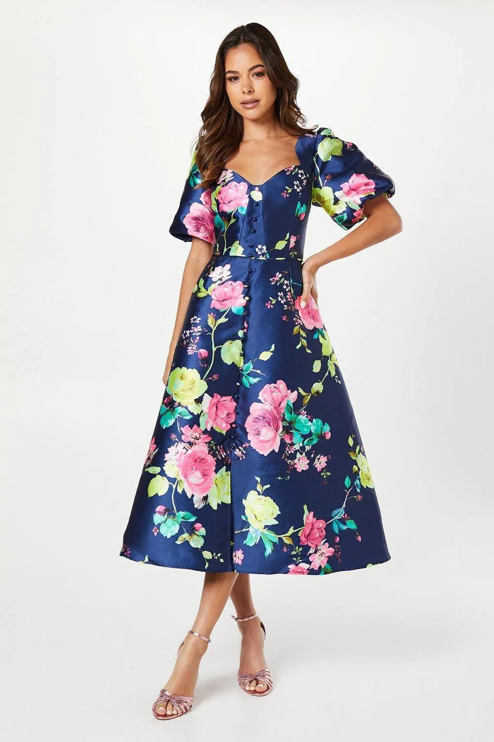 Coast Women's Floral Print Puff Sleeve Midi Dress in Navy
