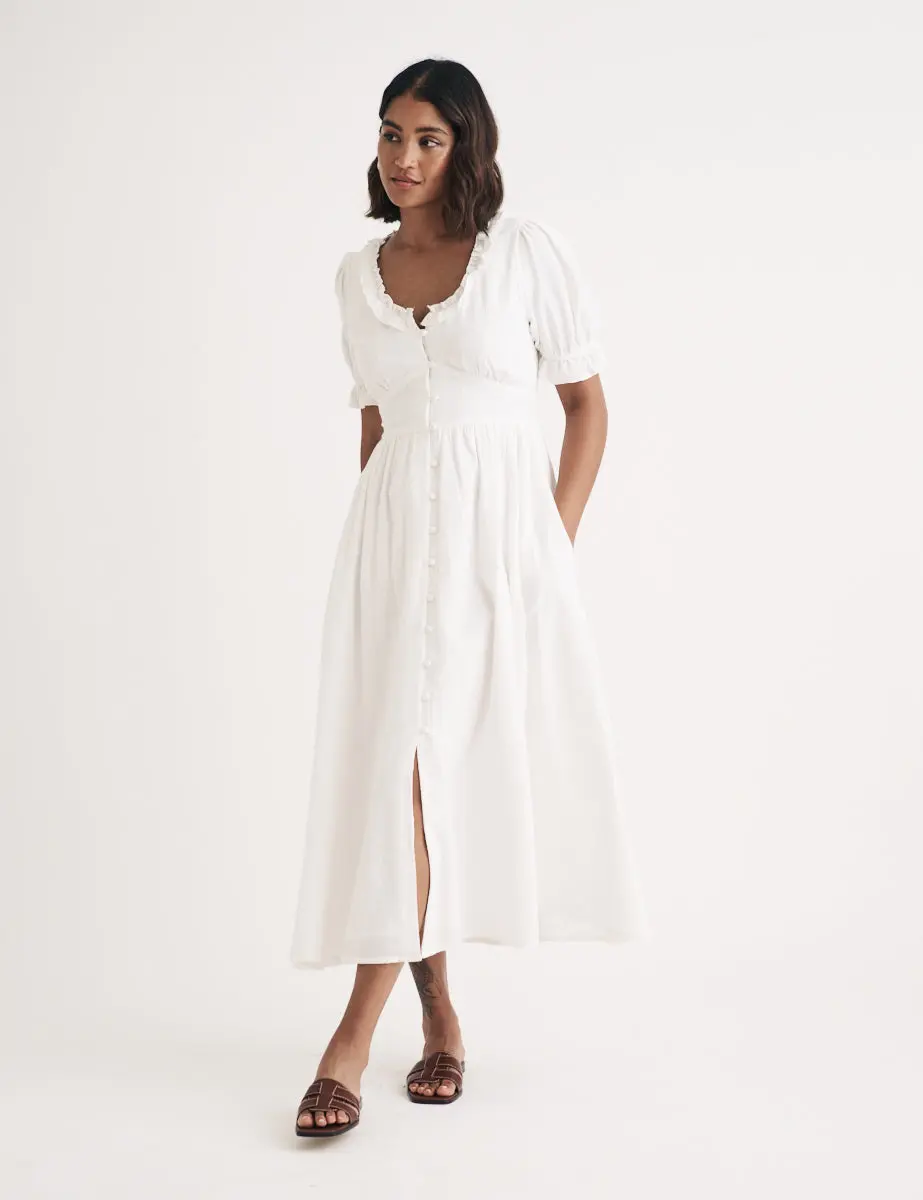Introducing Flossie, the perfect summer dress. Made entirely from organic cotton, she comes in a classic white shade. Pretty additions include puff sleeves, a frilled collar and panelled waist designed to flatter. Swing a straw bag over your arm and go. Round neck Short puff sleeves Button front Panelled waist designed to flatter Centre slit