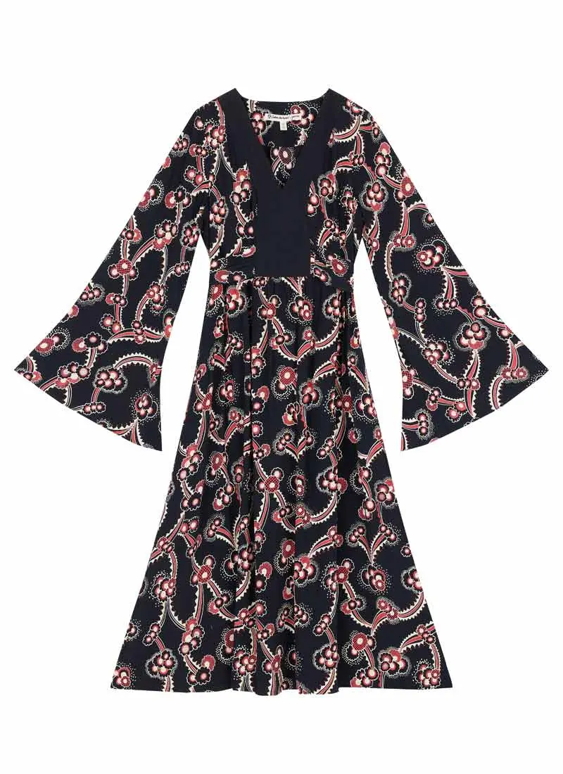A looser, cooler, kaftan-style dress that cinches in at the waist with a sensational back sash belt that ties in a big bow. Fabulous fluted sleeves and a contrast solid black banded neckline detail add 1970s retro details to this maxi dress, making it a style you’ll keep reaching for in decades to come. Celia Birtwell says: I designed ‘Mystic Daisy’ in the early ‘70s. It is one of my all-time favourite prints, although it was also one of the quickest to be made! I saw it in my mind’s eye, and within minutes, it was on the drawing board. I think it looks really dignified here – the black yoke and scale used by Joanie make it really attractive.Erica is 5'9 1/2 and is wearing a UK size 10Jasmine is 5'9 and is wearing a UK size 16Regular fit - take your usual sizeUK Size 10 dress length: 135cmAll-over archive Celia Birtwell printSolid black V-necklineFlared sleevesElasticated back waist with half sash beltPocketsFor specific measurements of this garment, please see the Size Guide.