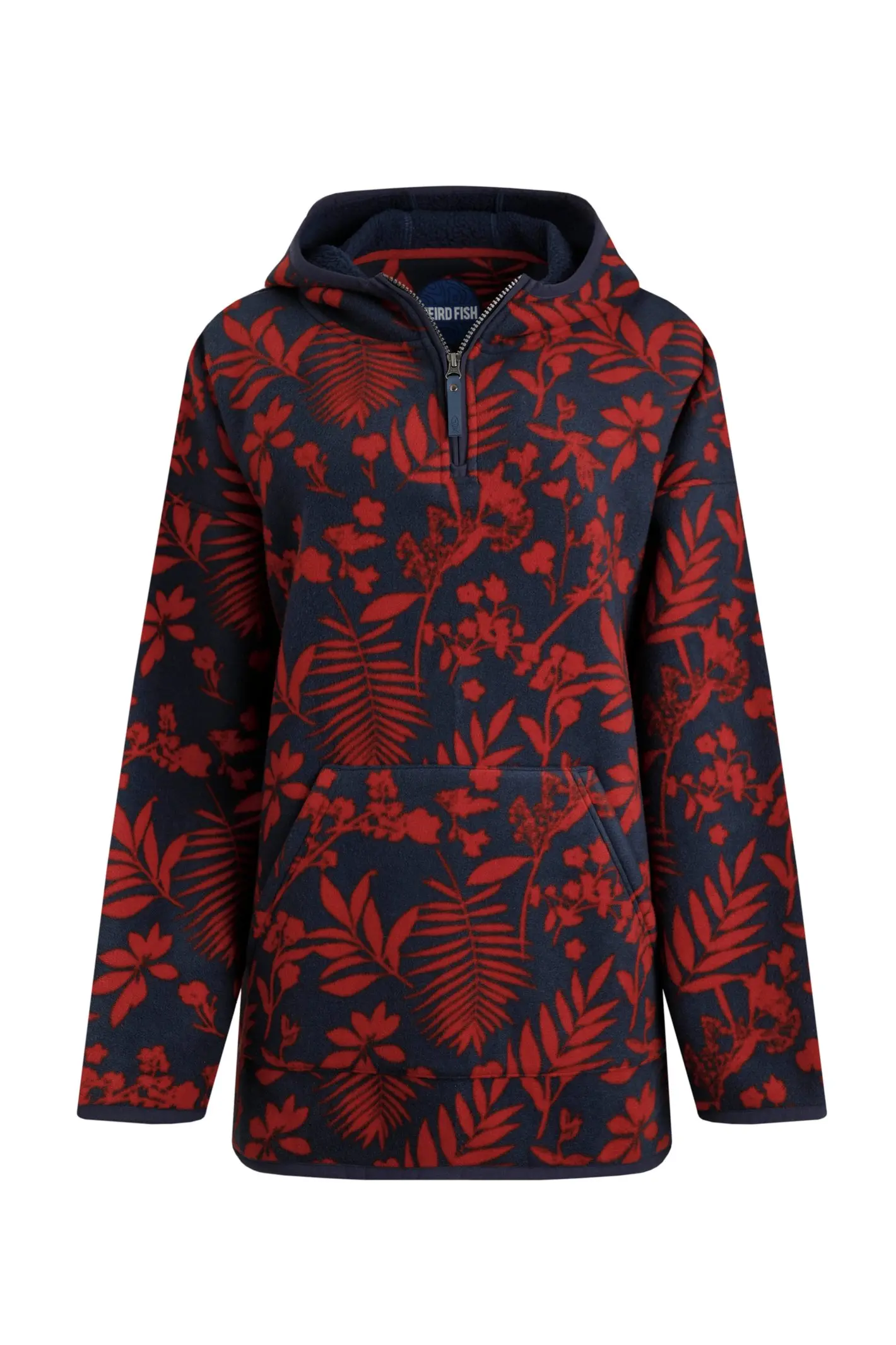 Welcome to our new outdoor range and the Ester eco printed polar popover hoodie. This tightly bonded fleece makes a great windcheater and we love the easy to wear oversized design which is great to throw on over whatever you are wearing for an extra layer of warmth. It has a long drop-tail back a kangaroo pocket elasticated cuffs and a good sized hood.Made with recycled polyesterOversized styledDroptail backKangaroo pocketSoft polar fleeceGood sized hoodWe love clothes and fabrics that do good recycled polyester is making waves as it is turning pre-existing plastics such as that water bottle you used at a festival a life time ago into your new Weird Fish favourite. Using more recycled polyester rather than traditional polyester reduces landfill which means less soil contamination air and water pollution. 100% Recycled Polyester30° Machine Wash