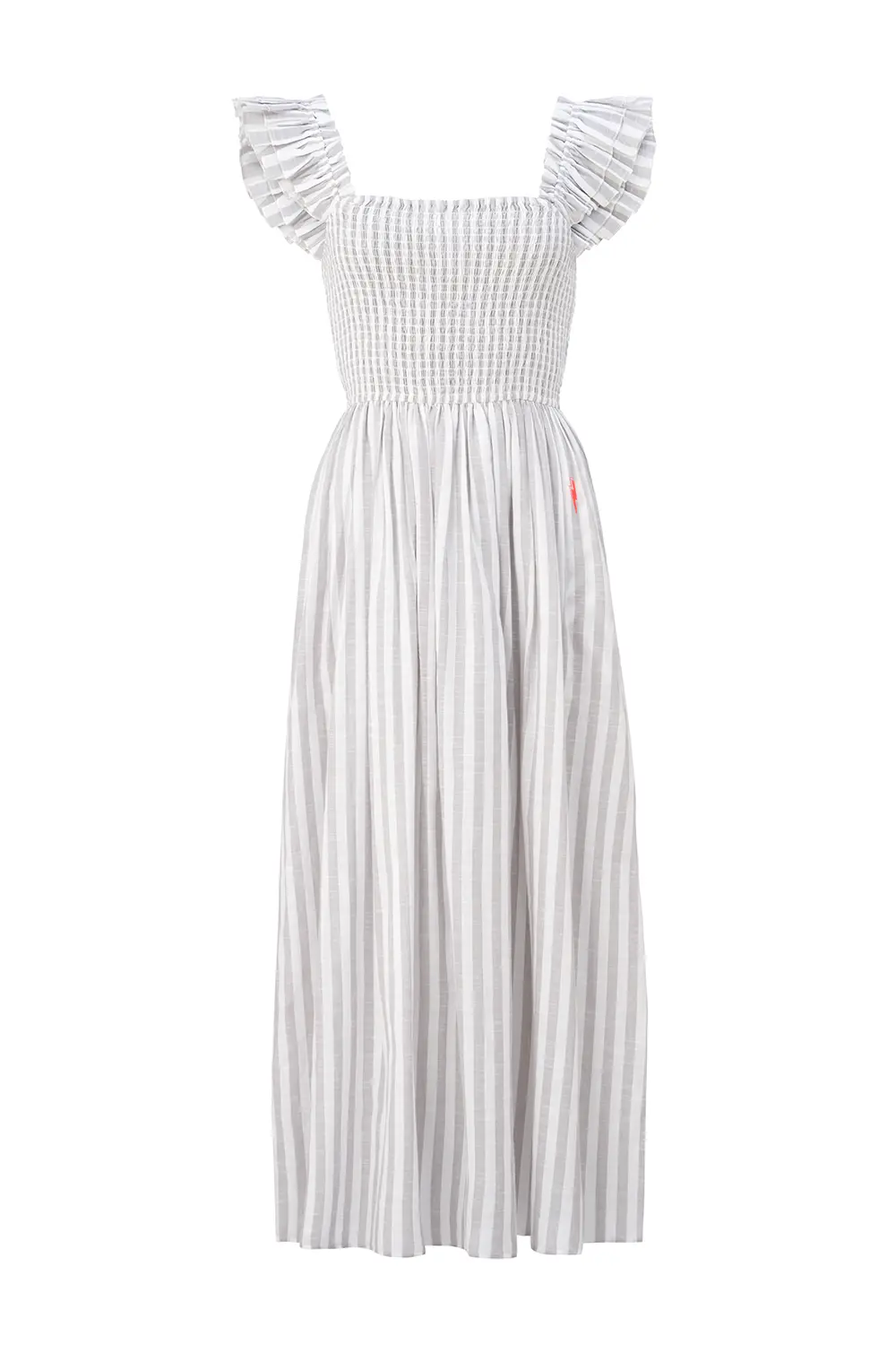Our grey with white stripe maxi sundress was made for hot weather days. For the ultimate summer look add a bag, sunglasses and sandals. Made using responsibly sourced cotton Grey with white yarn dyed stripe fabric Pretty sundress shape with ruffle sleeves Flattering shirring across the bust Maxi length Side seam pockets Signature neon pink embroidered lightening bolt on the hip Model in the image isSize 8Height 5'9 1/2Wearing a size 8 Love this style? Explore our full range of dresses.