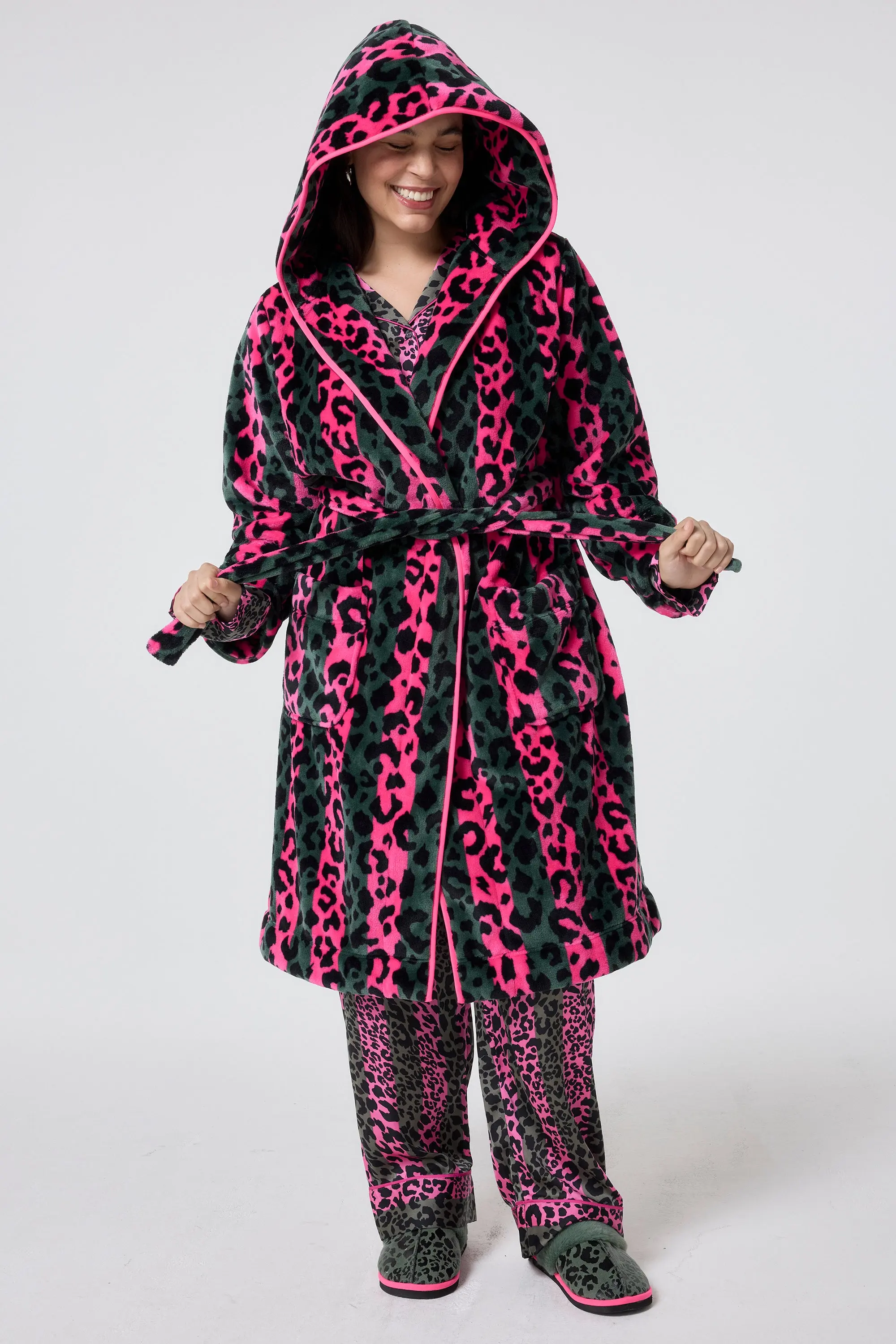 Wrap up warm in our super soft and cosy khaki with pink stripe and leopard print dressing gown. Featuring a cosy hood, long sleeves and spacious front pockets, it fastens with a self fabric tie belt. Perfect for wrapping up warm on chilly mornings and evenings. Made from soft recycled polyester Two deep front pockets Neon pink piping on hood and centre front Wrap fastening and self fabric tie belt Signature neon pink embroidered lightning bolt on the sleeve Matching kids dressing gown also available Model in image 1 isSize 8Height 5'8 Wearing a size 6/8 Model in image 2 is Size 18 Height 5'9 Wearing a size 18 Discover stylish pyjamas to wear beneath your dressing gown.