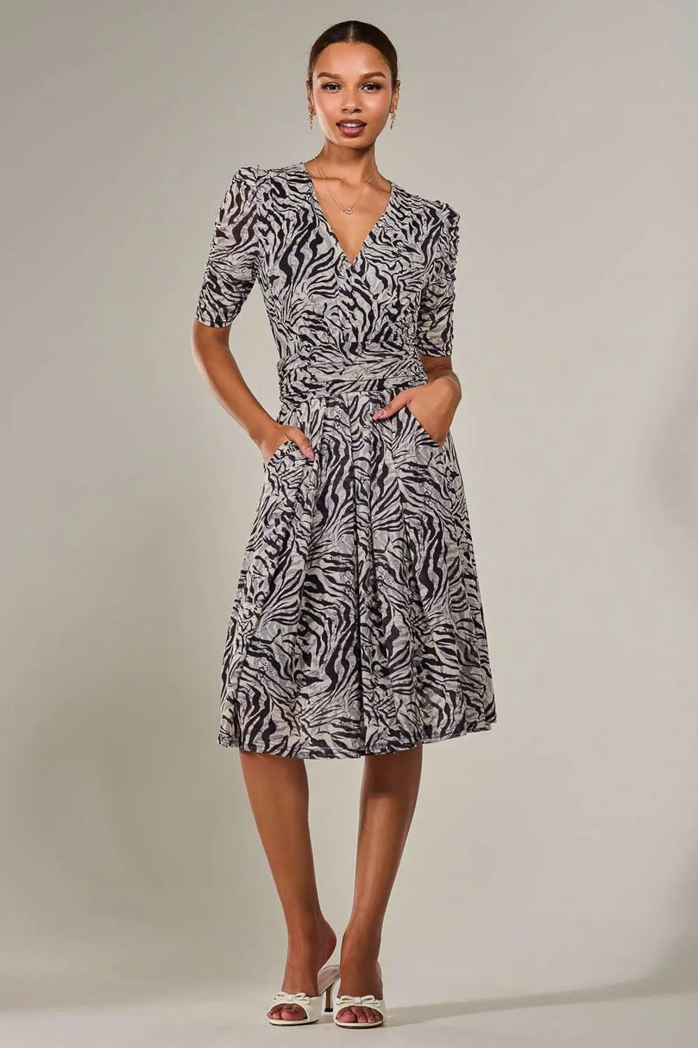 Our Mesh Half Sleeve Midaxi Dress by Jolie Moi will make you feel fabulous, adorned in a chic animal print layered over the softest mesh fabric, which is fully lined for the perfect balance of comfort and sophistication. The ruched mesh sleeves with shoulder ruffle detailing makes this dress extremely flattering, as well as the thick ruched waist band for that cinched in look. Its an over the head style with discreet side from pockets, adding practicality to this elegant piece which also has a soft pleated skirt which falls perfectly at a midi length, and a faux wrap v neckline.