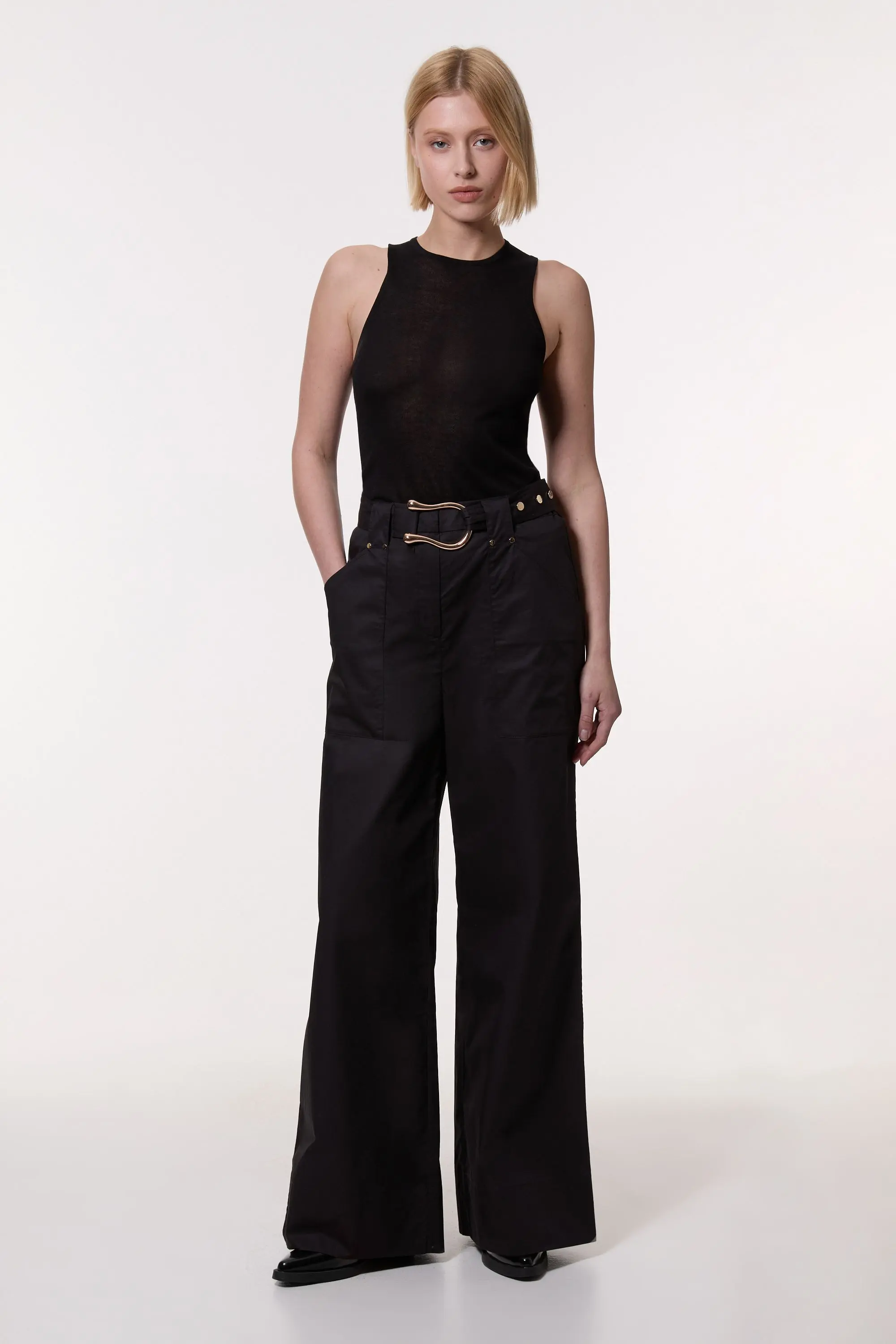 Cotton Sateen Utility Detail Belted Trouser With Gold Hardware Detail - Black