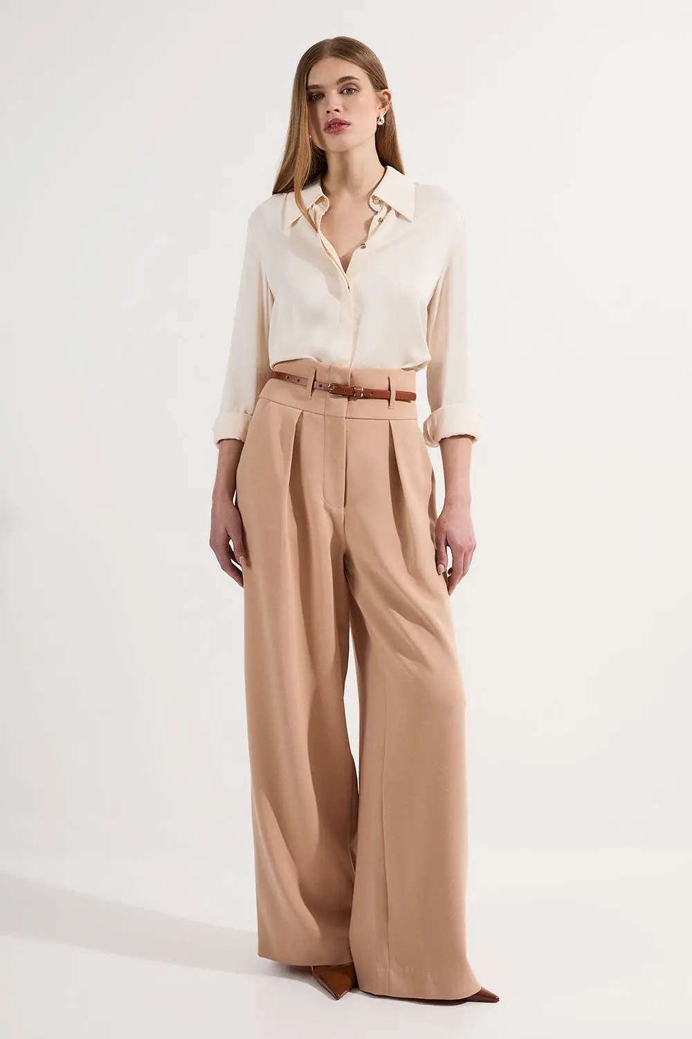 Compact Stretch Essential Tailored High Waist Wide Leg Trouser - Camel