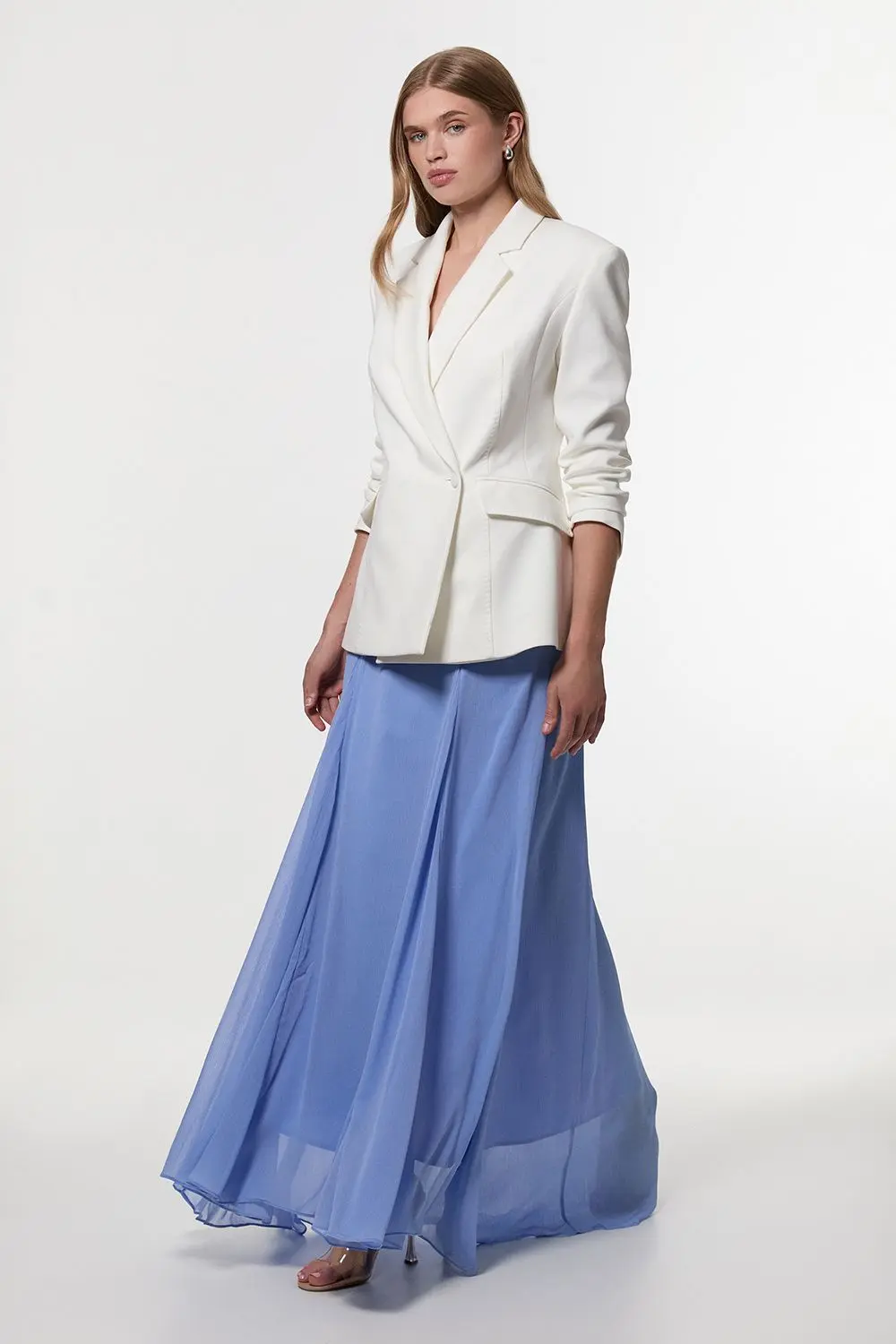 Compact Stretch Stab Stitch Asymmetric Wrap Tailored Blazer - Ivory - This Karen Millen asymmetric wrap blazer redefines daywear tailoring with its contemporary twist on a classic. The structured shoulders and tailored fit create a flattering silhouette, whilst the stretch fabric ensures all-day comfort without compromising on style. As seen on our model, pair with coordinating wide-leg trousers for an effortlessly chic monochromatic ensemble, or contrast with slim-fit denim for a smart-casual approach. Complete your look with statement jewellery and oversized sunglasses for brunch dates, or style with a structured tote and flat sandals for gallery visits and shopping trips. The versatile design transitions seamlessly from office meetings to weekend gatherings, making it an indispensable addition to your capsule wardrobe. Layer over a silk camisole or fine knit depending on the season for maximum styling flexibility. Distinctive asymmetric wrap design with elegant stab stitch detailing Tailored silhouette with structured shoulders for a refined look Collared neckline with notched lapels adding classic sophistication Stretch fabric construction allowing comfortable movement throughout the day Functional side pockets perfect for small essentials