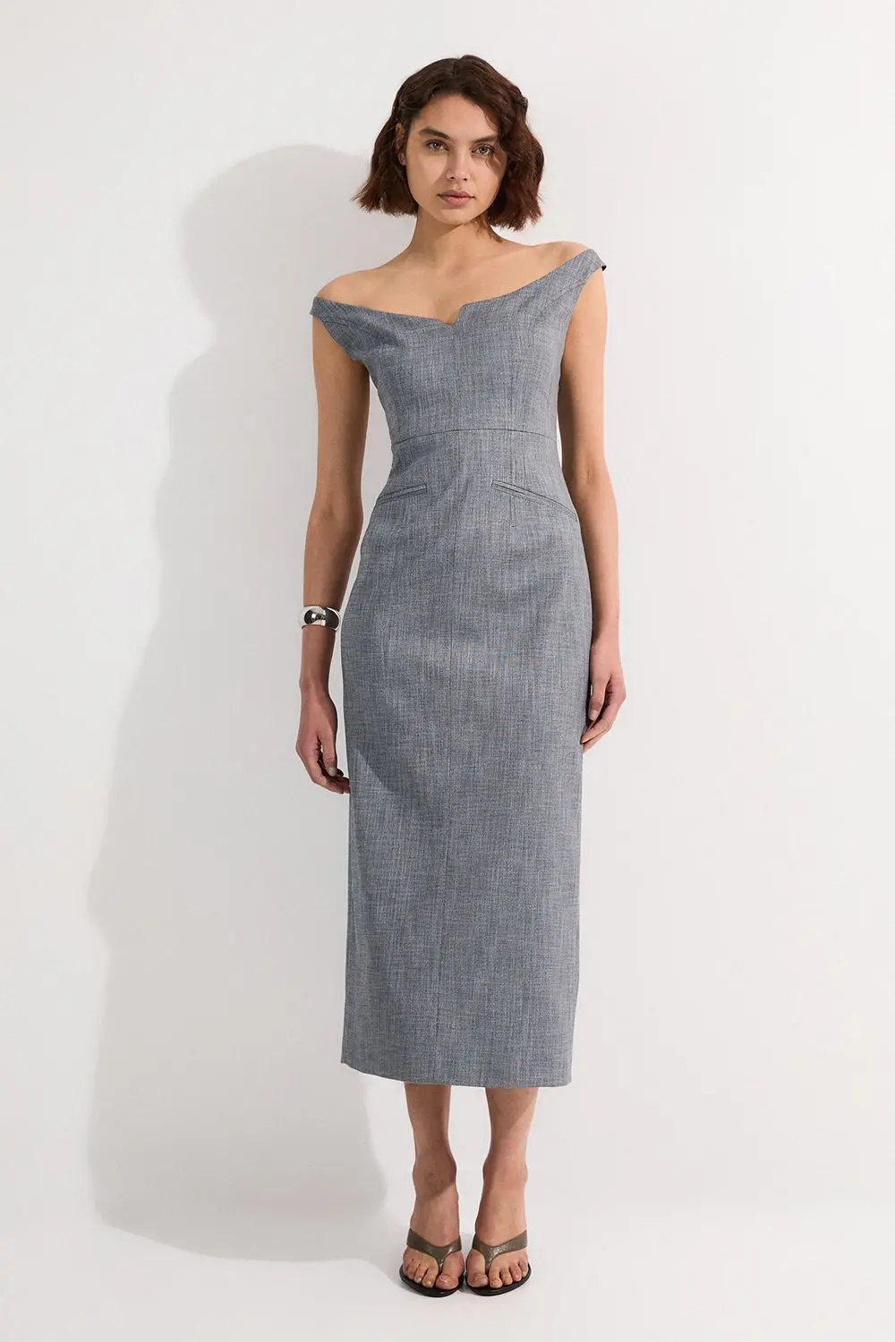 Tailored Marl Strappy Pencil Maxi Dress - Navy - The Karen Millen Tailored Marl Strappy Pencil Maxi Dress presents a masterclass in understated daywear elegance. The off-shoulder design creates a flattering neckline that showcases your decolletage, whilst the tailored silhouette gently skims your curves for a refined look. Style this versatile piece with flat leather sandals as seen on our model for casual family gatherings or weekend brunches. For a more polished daytime ensemble, pair with block-heeled mules and a structured tote. The midi length offers a contemporary twist on the classic pencil dress, making it suitable for gallery visits or upscale lunch dates. The subtle marl texture adds depth to this seemingly simple design, whilst the back vent ensures comfort throughout the day. This dress effortlessly bridges the gap between casual and smart-casual occasions. Elegant off-shoulder design with a distinctive sweetheart neckline Figure-enhancing tailored pencil silhouette that contours the body Sophisticated marl fabric with subtle texture for added visual interest Practical side pockets discreetly integrated into the streamlined design Back vent detail for ease of movement and refined finishing touch