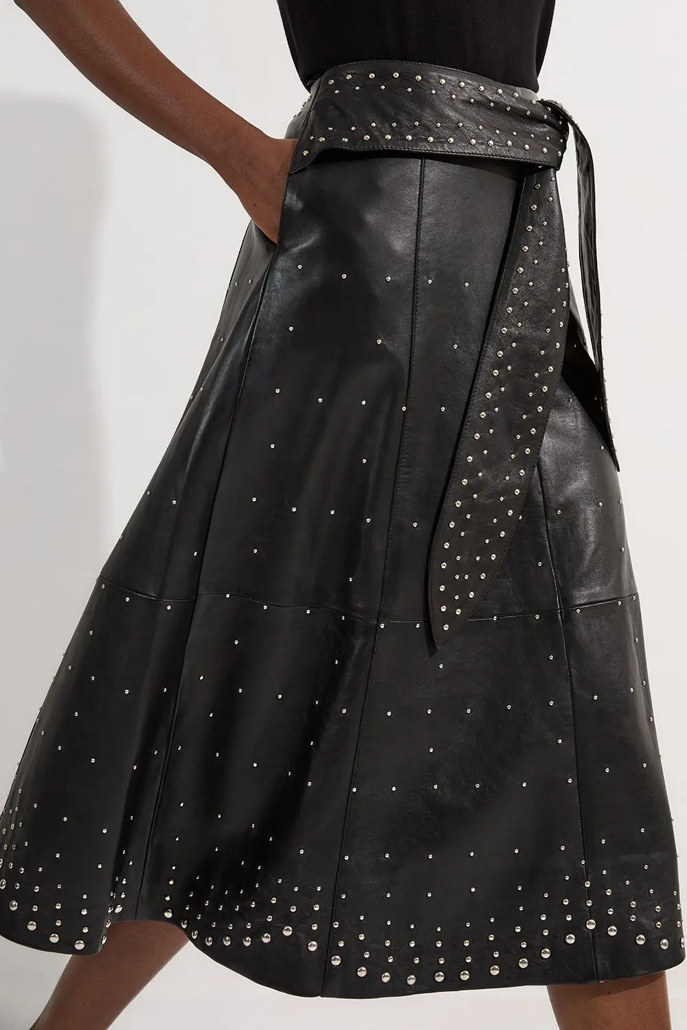 Studded Leather Tie Belted Full Midi Skirt - Black