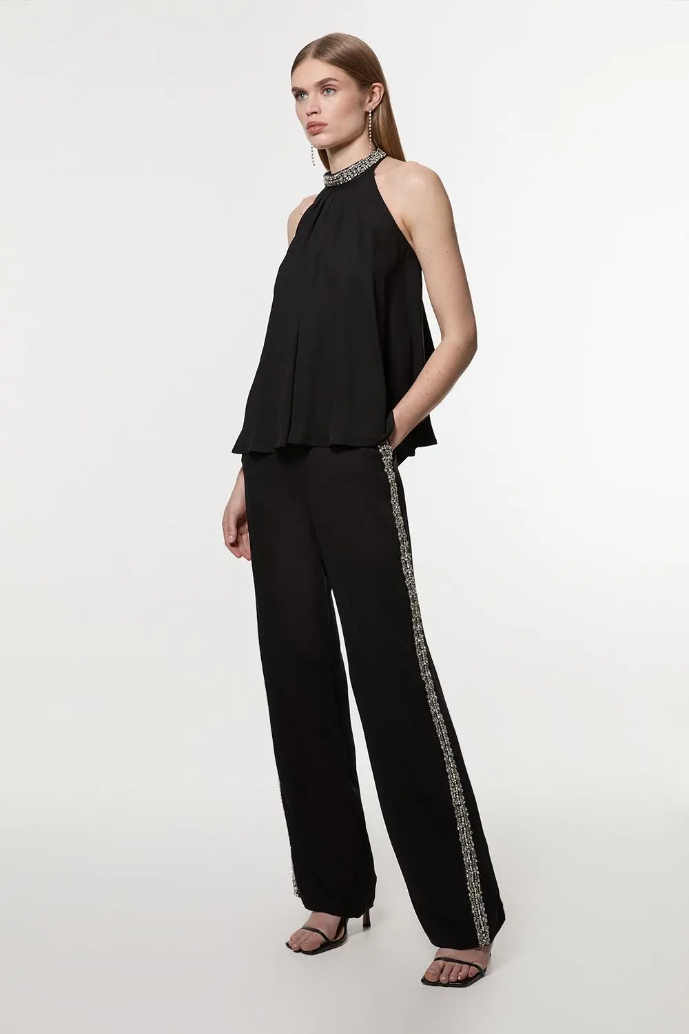 Hand Embellished Cady Woven Trouser - True Black - Experience sleek tailoring in a pair of straight leg trousers, with a flattering, relaxed fit and a comfortable high waistline. The sparkling embellishments are hand placed and make for a striking occasion look. Style it with the matching top for a co-ordinating look, or with a blazer and boots for a more laid back approach. Hand Embellished Cady Woven Trouser High Quality Tailored Design Comfortable High Waistline Flattering Straight Leg Fit Sparkling Hand Embellished Strip Down Sides Pocket Accents Matching Top Sold SeparatelyDiscover our collection of occasion wear or browse our range of women's occasion dresses now.