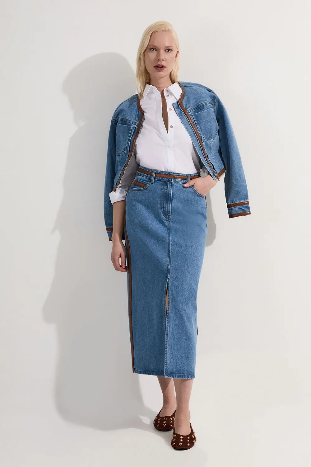 Denim & Faux Leather Tipped Side Pencil Midi Skirt - Light Blue