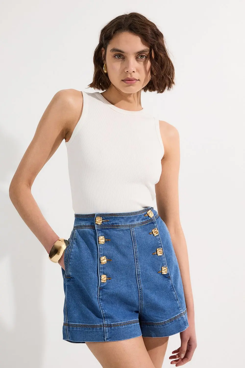 Denim Button Front Tailored Shorts - Mid Blue - Denim Button Front Tailored Shorts