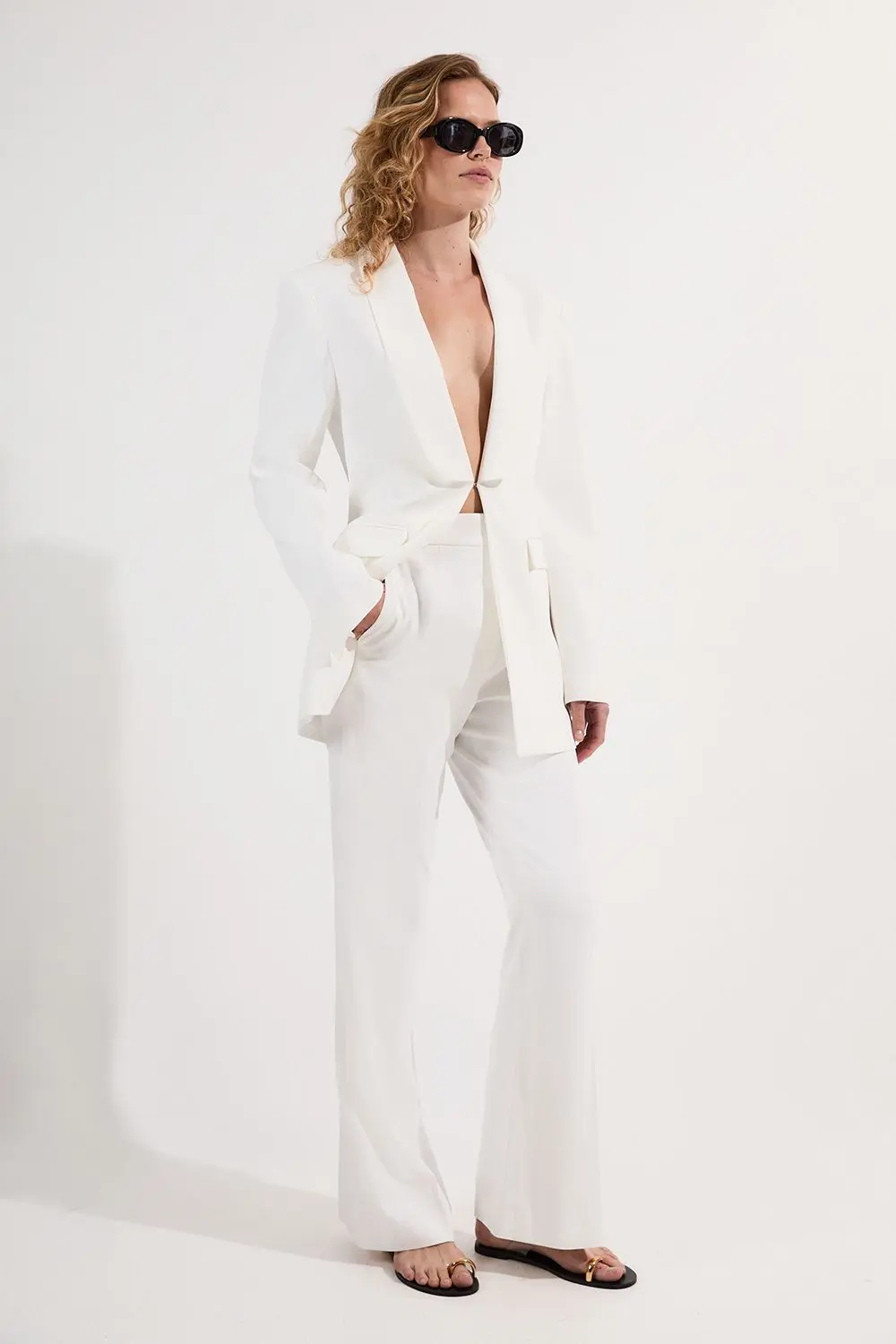 Polished Tailored Kick Flare Trouser - Ivory - These polished kick flare trousers from Karen Millen offer the perfect balance of professional refinement and contemporary style. The tailored silhouette creates a sleek line through the hips and thighs before flaring from the knee, creating a figure-flattering shape that works for the office and beyond. Style as seen with a fitted button-front top and coordinating blazer for a sophisticated workwear ensemble, or dress down with a crisp white shirt and leather loafers for smart-casual occasions. The high-rise waistband defines your silhouette while the crease detailing maintains structure throughout the day. These trousers transition effortlessly from boardroom meetings to evening drinks, making them an indispensable addition to your professional wardrobe. Tailored kick flare design High-rise waistband with clean front fastening Front crease detailing Practical side pockets