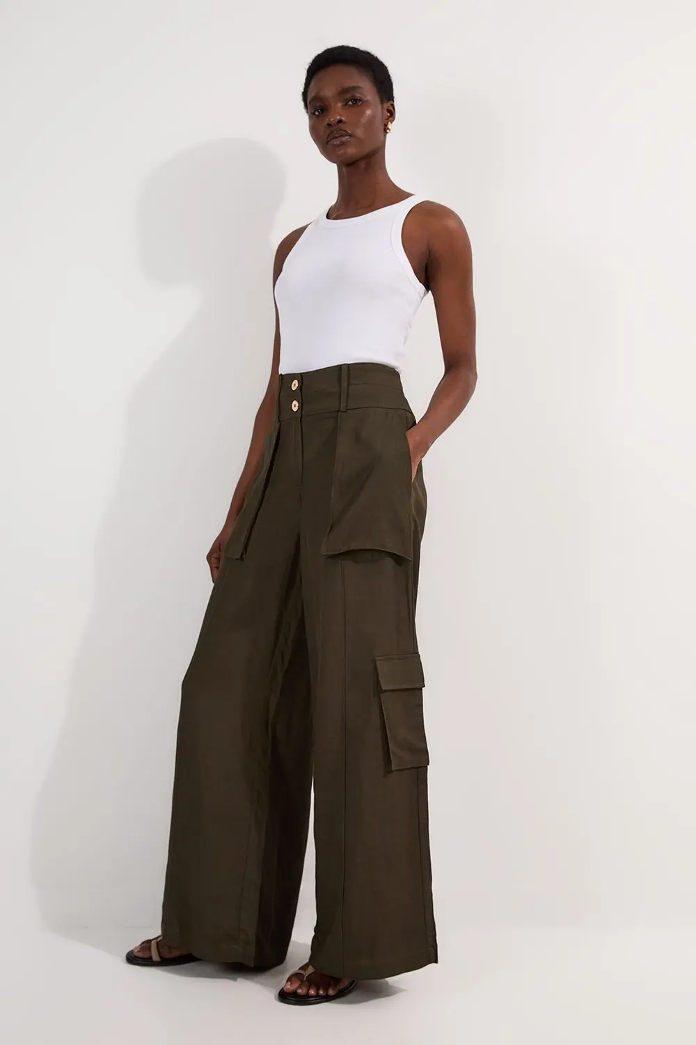 Premium Linen Twill Top Stitch Woven Trouser - Khaki/Green - These Karen Millen woven trousers combine contemporary utility styling with effortless sophistication. The wide-leg design creates a dramatic silhouette that moves with every step, while the linen-blend fabric ensures comfort throughout the day. Style with a fitted white vest top for a clean, minimalist aesthetic, or pair with an oversized shirt for relaxed weekend brunches. The neutral tone makes these trousers incredibly versatile - dress down with leather sandals and gold jewellery for daytime gatherings, or switch to a cropped blouse and flat mules for alfresco dining. The practical pocket detailing adds both visual interest and functionality, making these trousers a standout piece for your casual wardrobe that transitions seamlessly from city strolls to countryside escapes. Wide leg silhouette with distinctive top stitch detailing Multiple utility-inspired pockets including statement side cargo pockets Elegant high-rise waistband with double button fastening Linen-blend twill fabric Floor-sweeping length