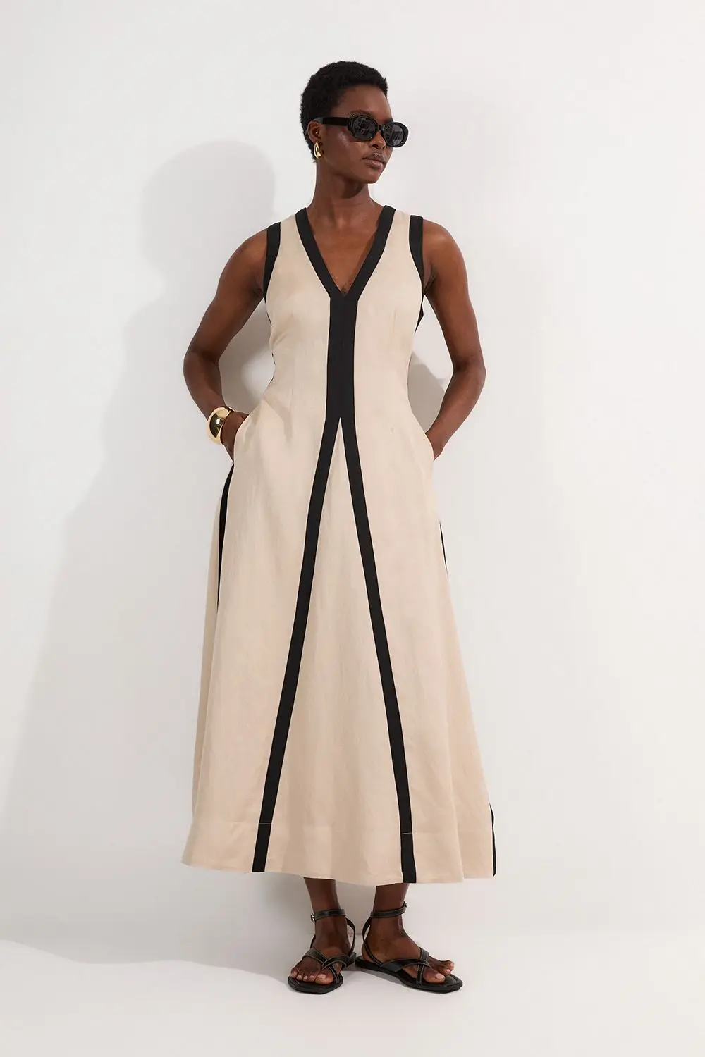 Contrast Linen Plunge Neck Woven Maxi Dress - Brown - This Karen Millen contrast panel maxi dress combines comfort and style for effortless daytime elegance. The distinctive plunge neckline and contrasting vertical panels create a figure-flattering effect that draws the eye downward, whilst the natural linen blend fabric provides a relaxed yet refined feel. For a polished daytime look, pair with espadrille wedges and a structured straw tote. The versatile midi length works for garden parties or seaside holidays - simply add statement earrings and a light cardigan for cooler evenings. The practical side pockets add an element of functionality to this graceful piece, making it a wardrobe essential for the fashion-conscious woman who values both style and comfort. Contrast panels Plunge neckline Crafted from breathable linen blend fabric Practical side pockets A-line silhouette with midi-length hem