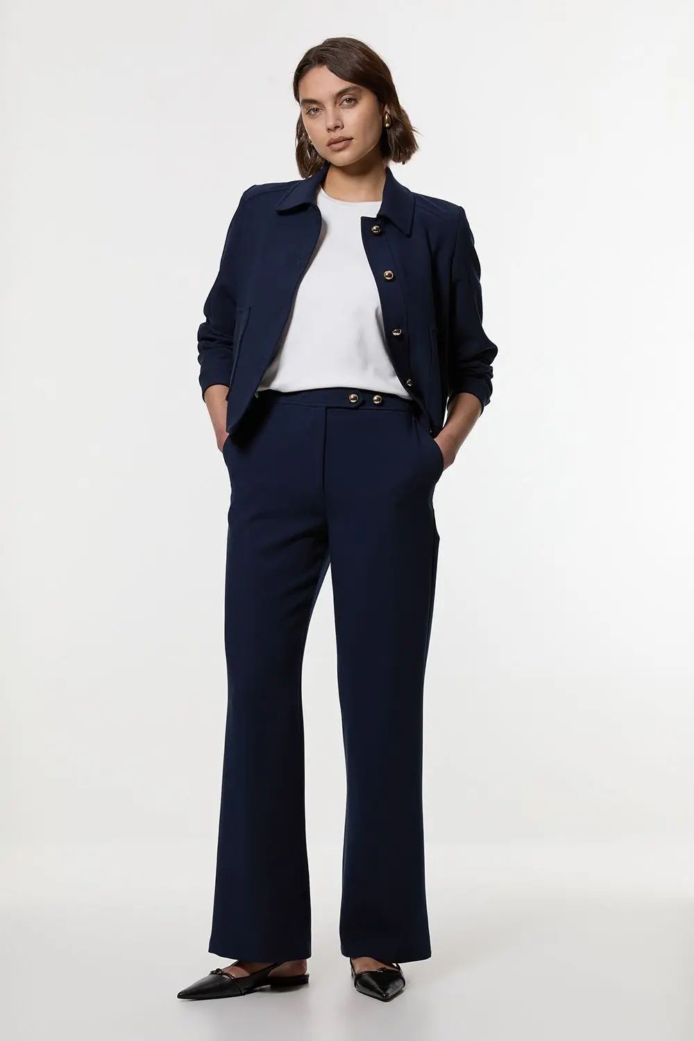Compact Stretch Tailored Kick Flare Trouser - Navy - These versatile tailored trousers from Karen Millen blend timeless sophistication with modern comfort. The kick flare silhouette creates a balanced proportion that flatters all figures, whilst the stretch fabric ensures you remain comfortable during long days at the office. Style with a crisp white blouse and structured blazer for a polished workwear ensemble, or pair with a fitted knit and pointed flats for a more relaxed yet professional look. The clean lines and elegant design make these trousers ideal for important meetings, presentations, or any occasion where you need to project confidence and professionalism. The mid-rise waist and regular fit provide a comfortable foundation for layering, making these trousers a true wardrobe workhorse that will serve you well throughout the seasons. Tailored kick flare design Stretch fabric construction Elegant gold-tone button detailing at the waistband Practical side pockets Regular fit