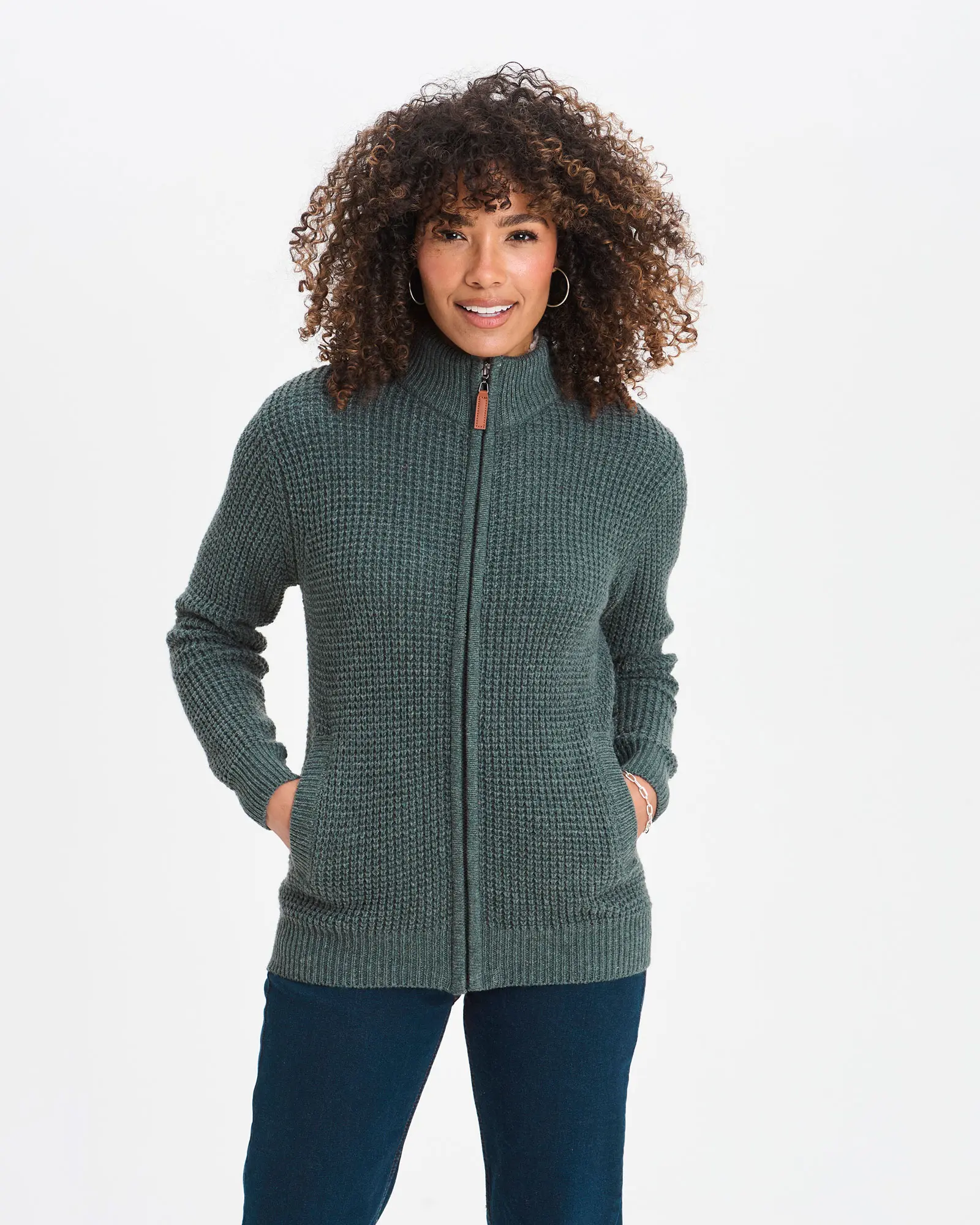 Soft knitted cardigan Sherpa fleece trim to the inner neck stand for warmth and softness Twin pockets Shape-saving rib to the neck, cuffs, and hem Zip-through fastening with faux leather zip puller Keeping cosy over the cooler months means layers, and this Sherpa-trimmed cardigan is the perfect layering piece. Zip it up over thinner layers to trap heat inside and enjoy the added warmth of the supersoft Sherpa fleece neck trim. Rib to the cuffs, neck and hem help hold the shape and keep you looking fresh with every wear, and we’ve added two handy side pockets to keep your hands cosy or valuables safe. Machine Washable50% Acrylic 45% Polyester 5% Wool | Cotton Traders Sherpa Trim Cardigan in Green, Polyester/Acrylic/Wool, Size XL