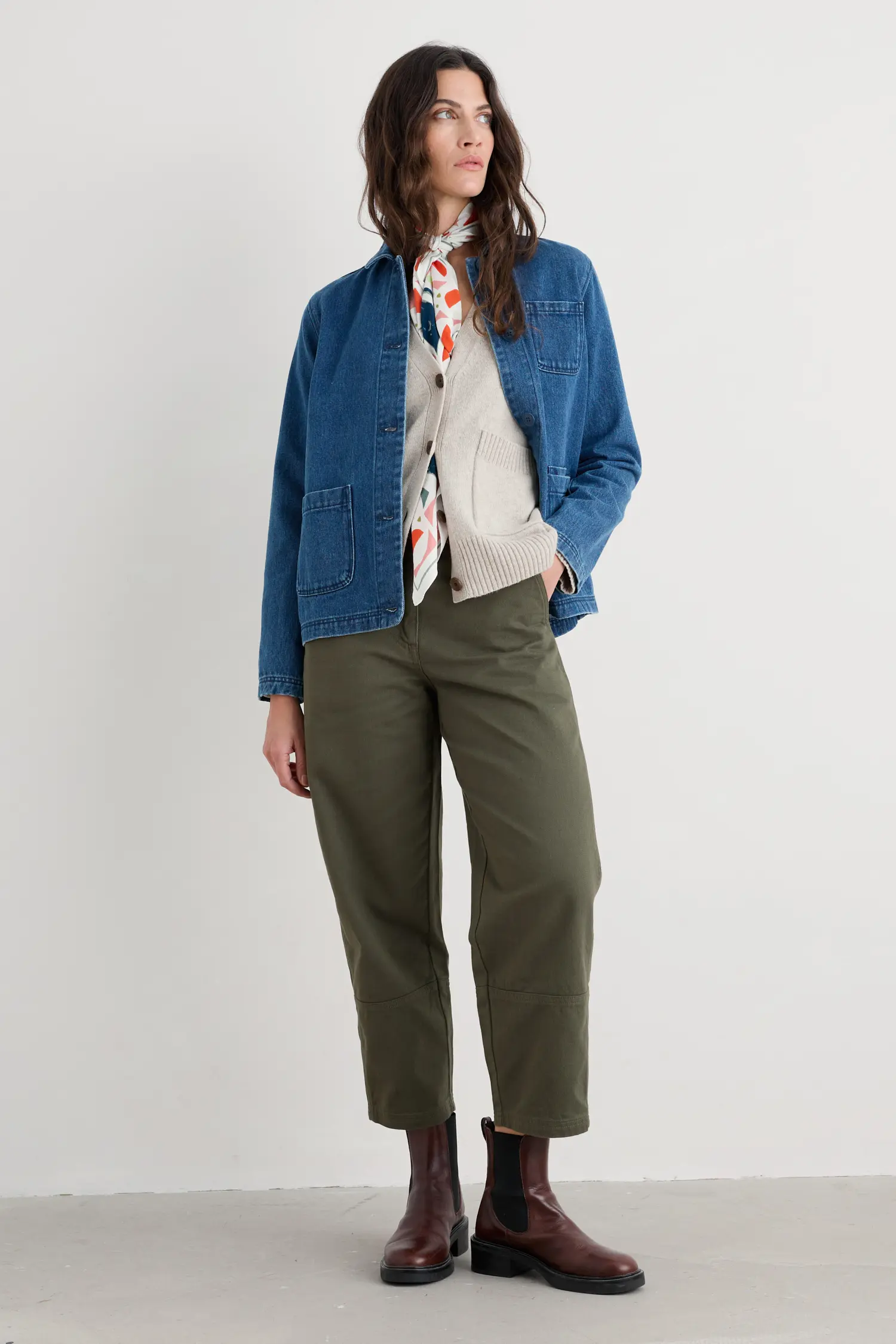 An easy pair of cropped trousers crafted from soft organic cotton, with a relaxed barrel-leg shape and an above-waist fit.