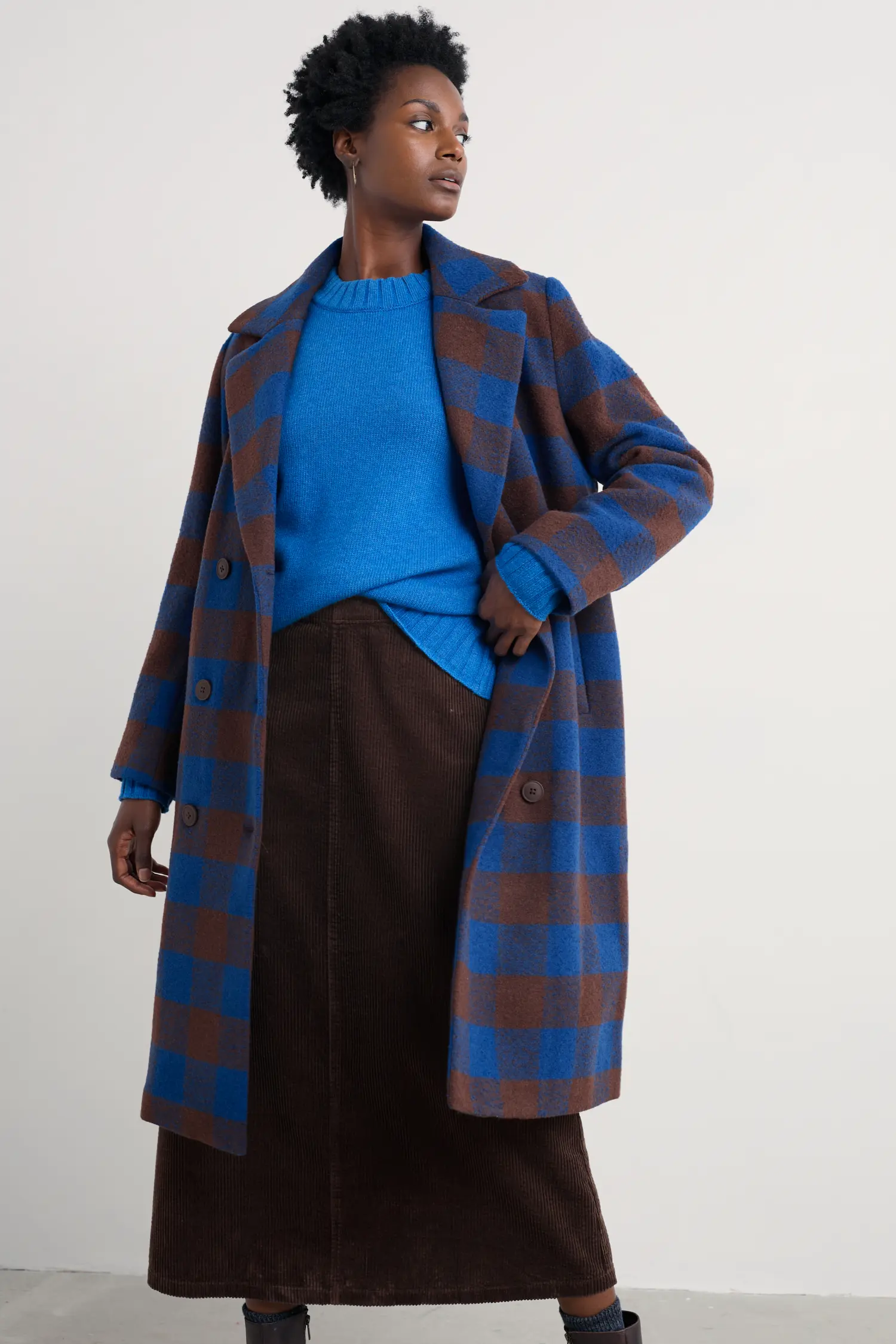 A double breasted coat made with recycled wool and recycled polyester with button fastening.
