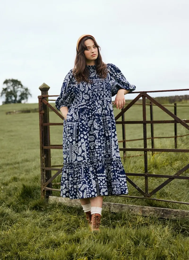 Paisley perfection. The Priya Dress is crafted from a breathable organic cotton cambric in an all-over navy and cream paisley handkerchief bandanna print and features a classic smock dress shape with a high neckline with frill detailing, a smocked bodice, poofy statement sleeves with elasticated cuffs, and a midaxi-length skirt with those all-important side seam pockets at the hips. No matter where you’re heading, Priya is always the dress for the occasion!Abigail is 5'10.5 and is wearing a UK size SLola is 5'10 and is wearing a UK size LRegular fit - take your usual sizeUK Size S dress length: 122.5cmOrganic cotton cambricAll-over navy and cream paisley bandanna handkerchief printFully-linedHigh, frilled necklineStatement sleevesSmocked bodicePockets For specific measurements of this garment, please see the Size Guide.