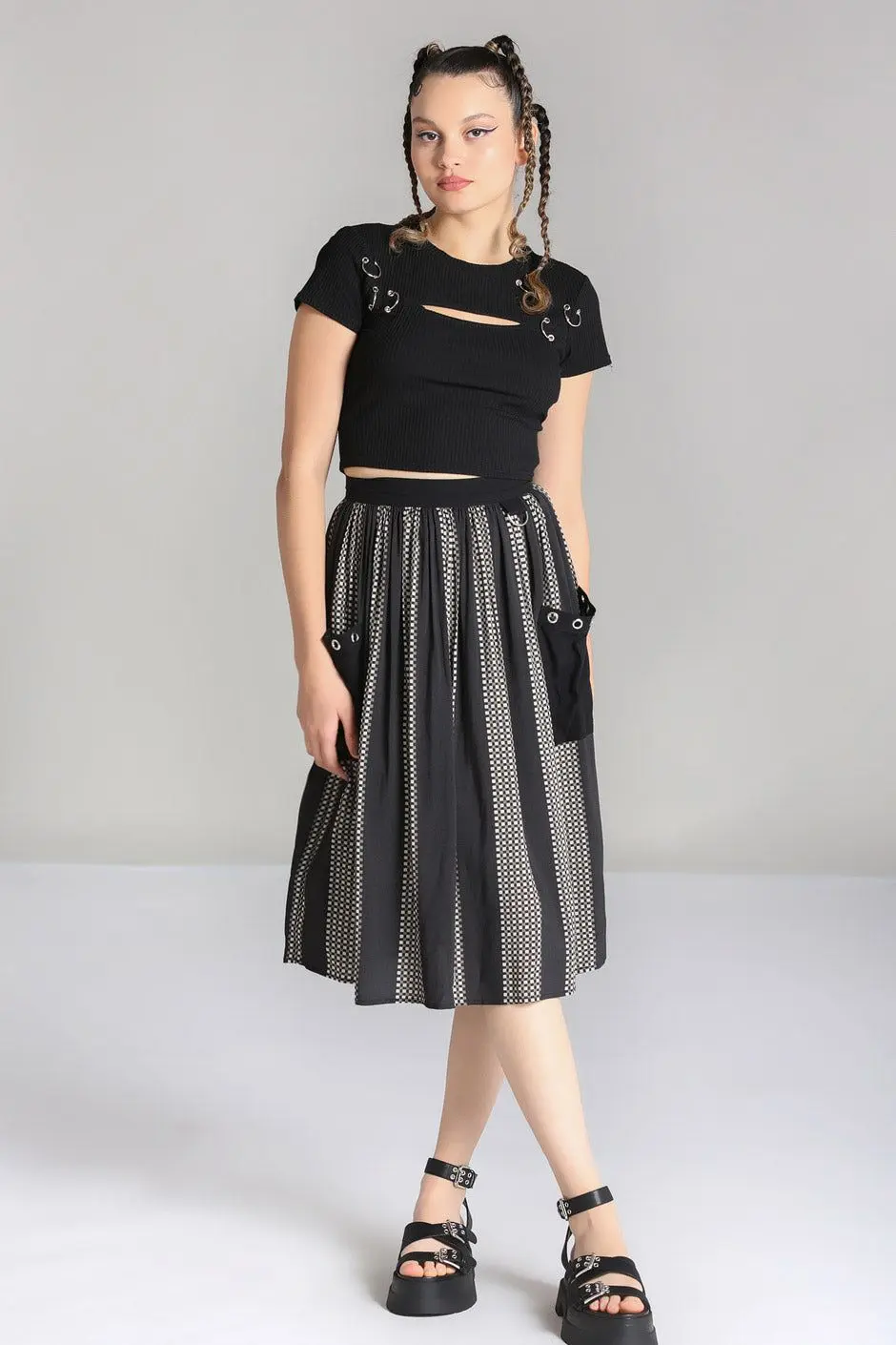 Viscose midi skirt Black and grey pattern with gingham stripes Wide waistband in black fabric Gathering from waistband Large silver D-ring detail on front 2 oversized pockets with silver large eyelet edging in plain black Button & zip fastening at centre back Fabric content: 100% Viscose Fit advice: Waistband has no stretch, stick to sizing advised on size guide for waist, hip measurement not needed as skirt is flared Length: Skirt length is 65cm from below waistband to hem Model: Storm is 5.7ft and wears size XS, Imogen is 5.9ft and wears 2XL