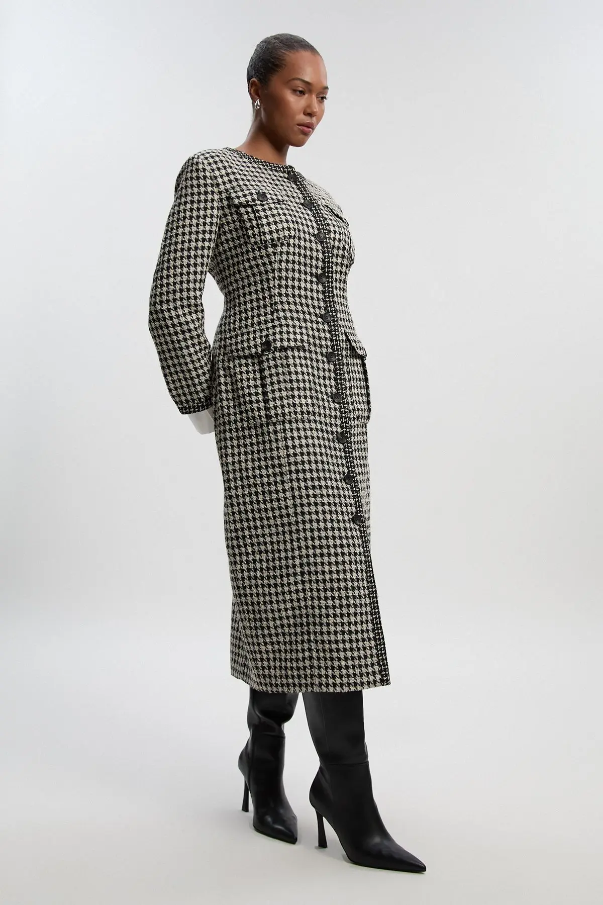 Plus Size Tailored Check Contrast Sleeve Pocket Front Midi Dress