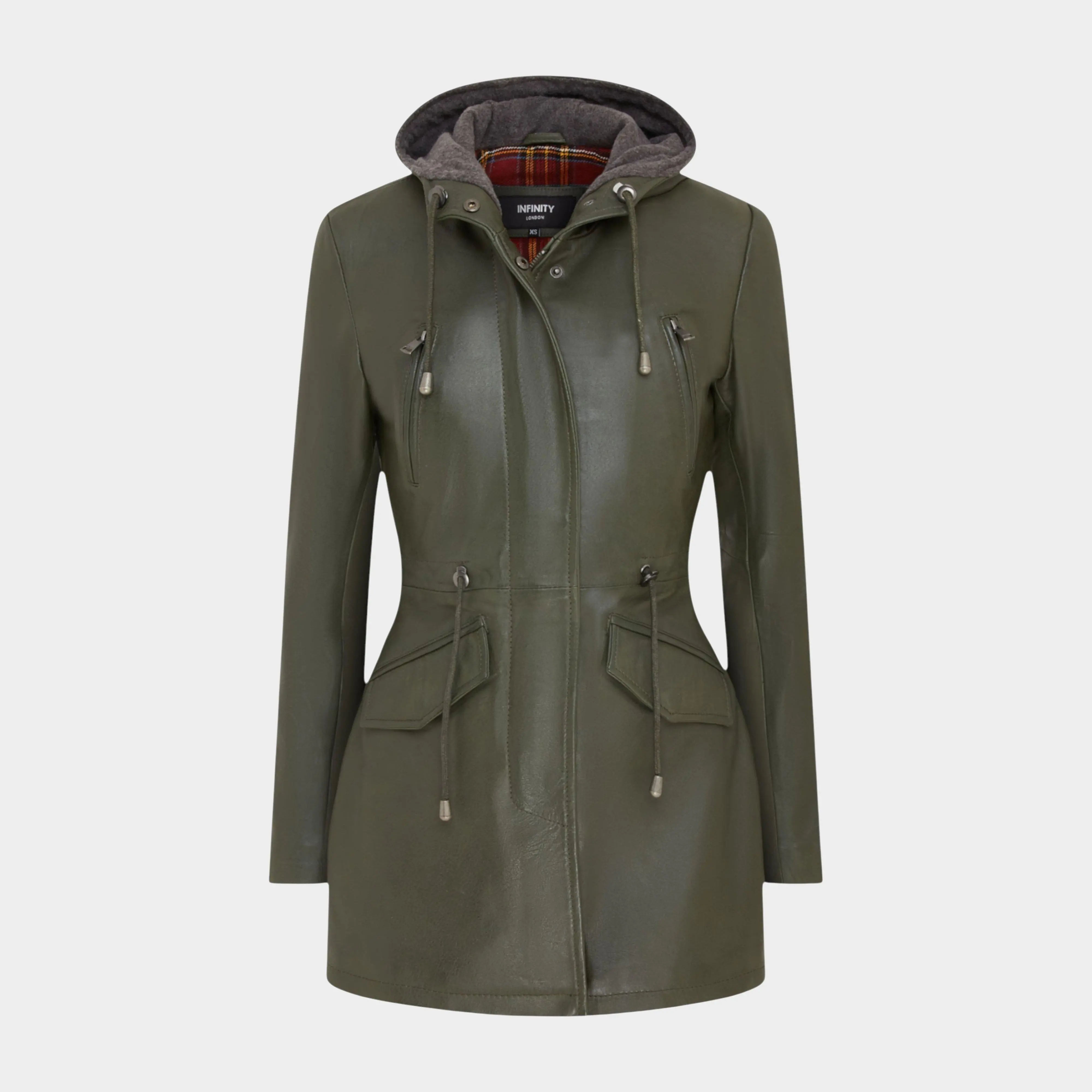 Infinity Leather Women's Mid Length Hooded Leather Parka Jacket, Green
