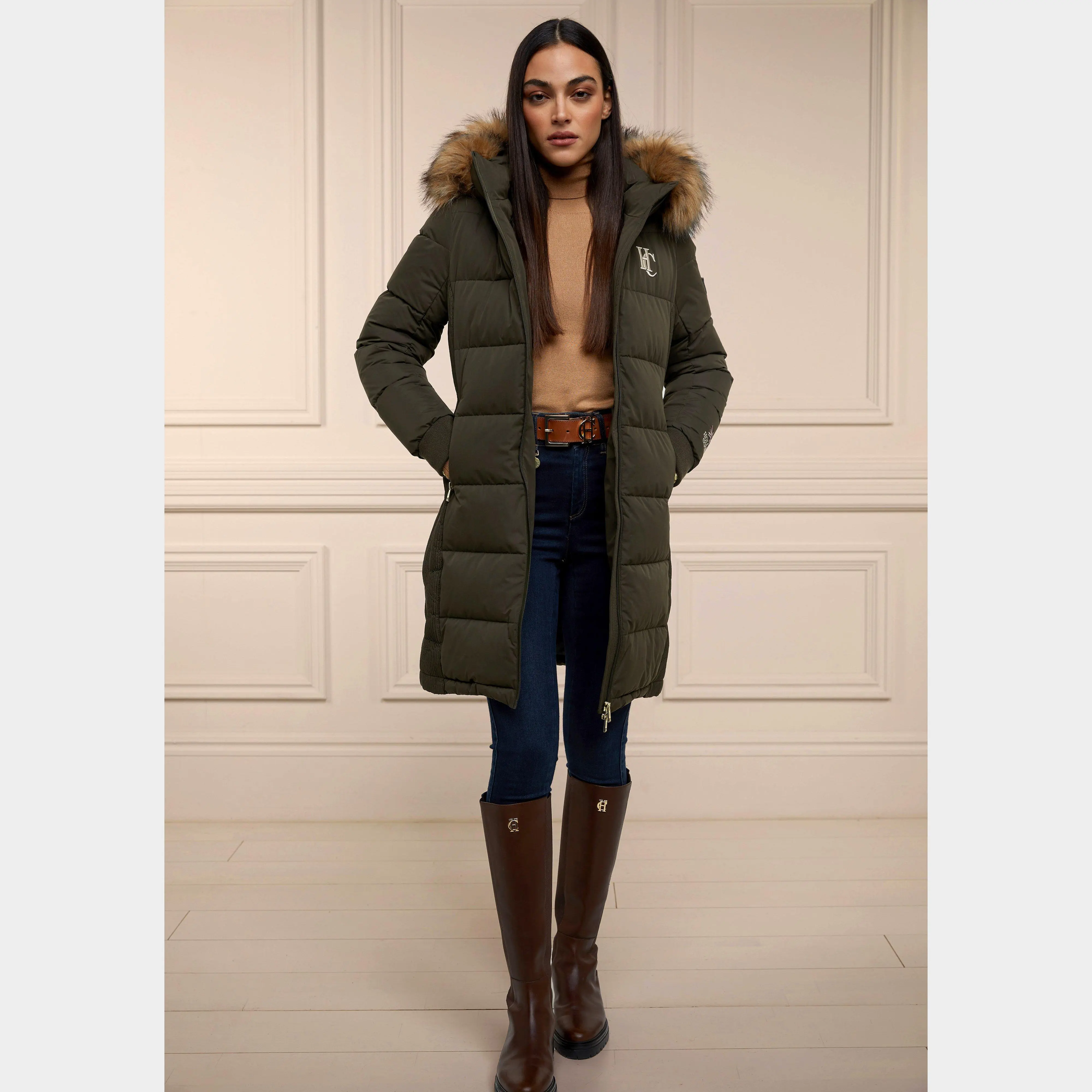 Holland Cooper Womens Team Padded Coat Khaki.The Holland Cooper Womens Team Padded Coat is a luxury coat which boasts both style and functionality.The Womens Team Padded Coat is designed with large scale modern baffles which have been fulled with a Sorona by Dupont synthetic downfill for superior warmth and eco-friendly insulation.The Jacket features shearing side panels for a close, flattering fit, waterproof zips on the front pockets protecting your essentials from the weather, ribbed cuffs to keep the cold out and warmth in, a detachable hood with a removable faux fur trim and it is finished with Holland Cooper premium embroideries which add a touch of elegance,_Fabric & Care:Outer - 100% Polyester Microfibre.Lining - 100% Polyester.