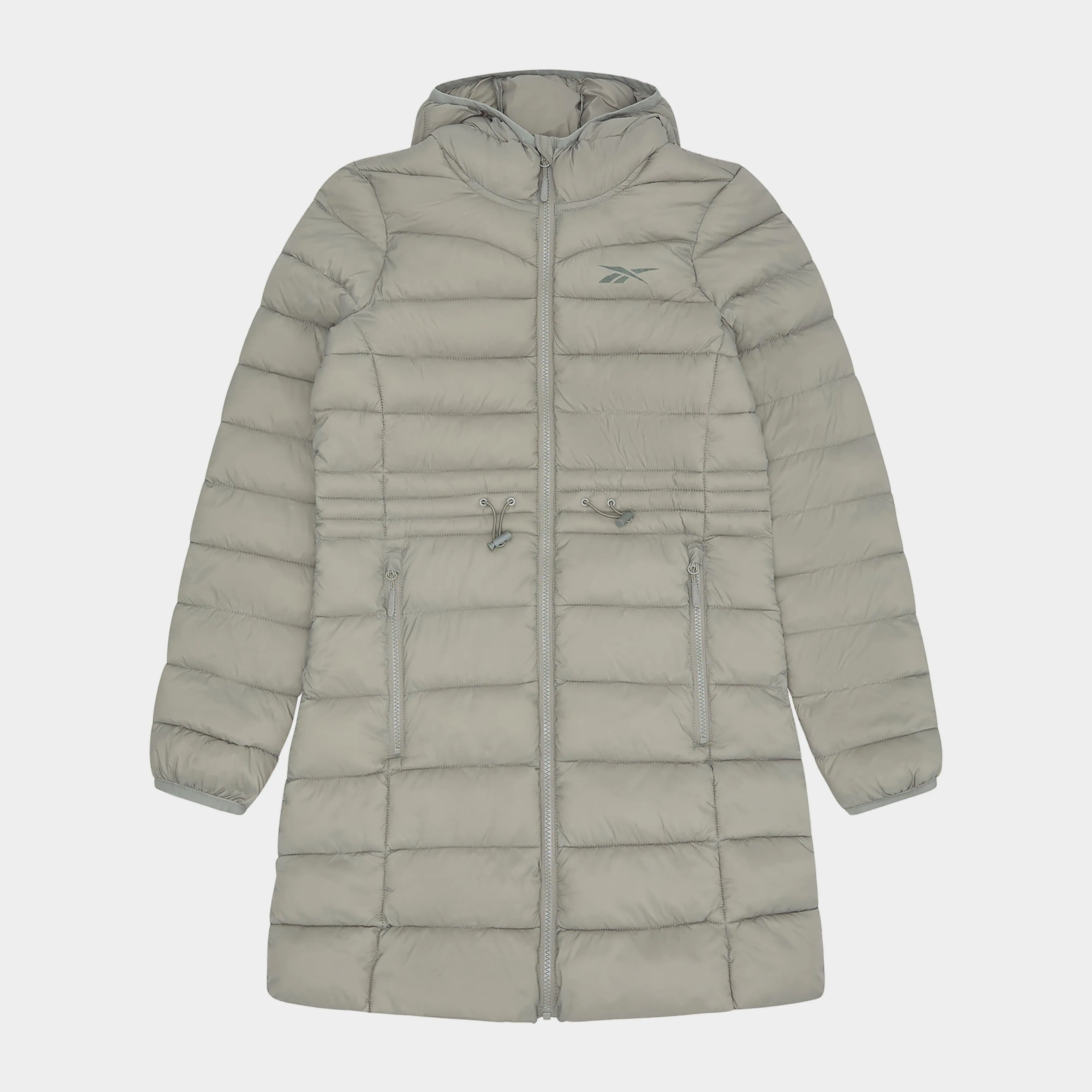 This long-length padded jacket provides extended coverage in colder weather. Horizontal quilting locks in heat, while a cinched waist adds shape and definition. The jacket features zipped side pockets, a full-zip closure, and a hood. Made with a smooth polyester shell, it's soft yet protective. This silhouette blends casual comfort with functionality for everyday wear.