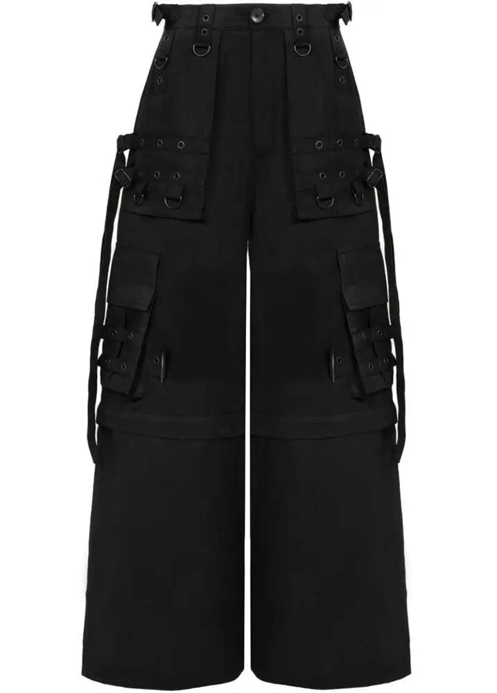 Step into the dark, alternative world of grunge fashion with the Hell Bunny Neo Transformer Trousers. Designed in a relaxed, baggy fit, these striking black trousers combine edgy gothic detailing with everyday comfort. Crafted from 100% cotton, the Neo Transformer trousers feature a self-fabric waistband enhanced with eyelet-studded belt loops and bold D-ring accents, adding an unmistakably punk edge. The front fastening with button and zip ensures a secure fit, while the adjustable waist straps let you tailor your silhouette effortlessly. Four oversized cargo pockets with decorative eyelet straps deliver both functionality and rebellious flair, perfect for carrying essentials while keeping your look unapologetically alternative. A distinctive zip-off section below the knees transforms these trousers into versatile knee-length shorts, making them ideal for year-round wear. Finished with large D-ring details and extra-wide legs, these trousers are the ultimate statement piece for goths, punks, and anyone with a taste for dark streetwear style. Whether paired with platform boots and a band tee or layered with chains and mesh, the Hell Bunny Neo Transformer Trousers let you express your individuality with bold confidence. Length: Inside leg is 77cm. Model: Emily B is 5.8ft and usual wears XS, in this photo she is wearing size Small. Black Wide leg trousers 4 large cargo style pockets with eyelet straps Zip off section just below knees 100% Cotton