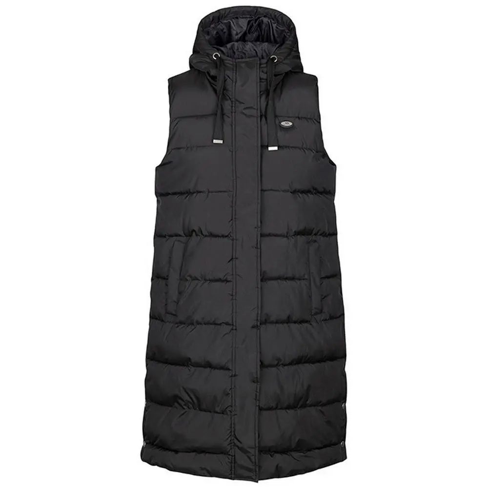 Material: 100% Polyester. Fabric: Pongee. Lining: Taffeta. Design: Logo, Quilted. Fabric Technology: Durable, Insulating. Neckline: Hooded. Sleeve-Type: Sleeveless. Stitched Baffles, Storm Flap. Hood Features: Drawstring, Grown On Hood. Length: Long. Pockets: 2 Side Pockets. Fastening: Concealed, Full Zip, Stud.