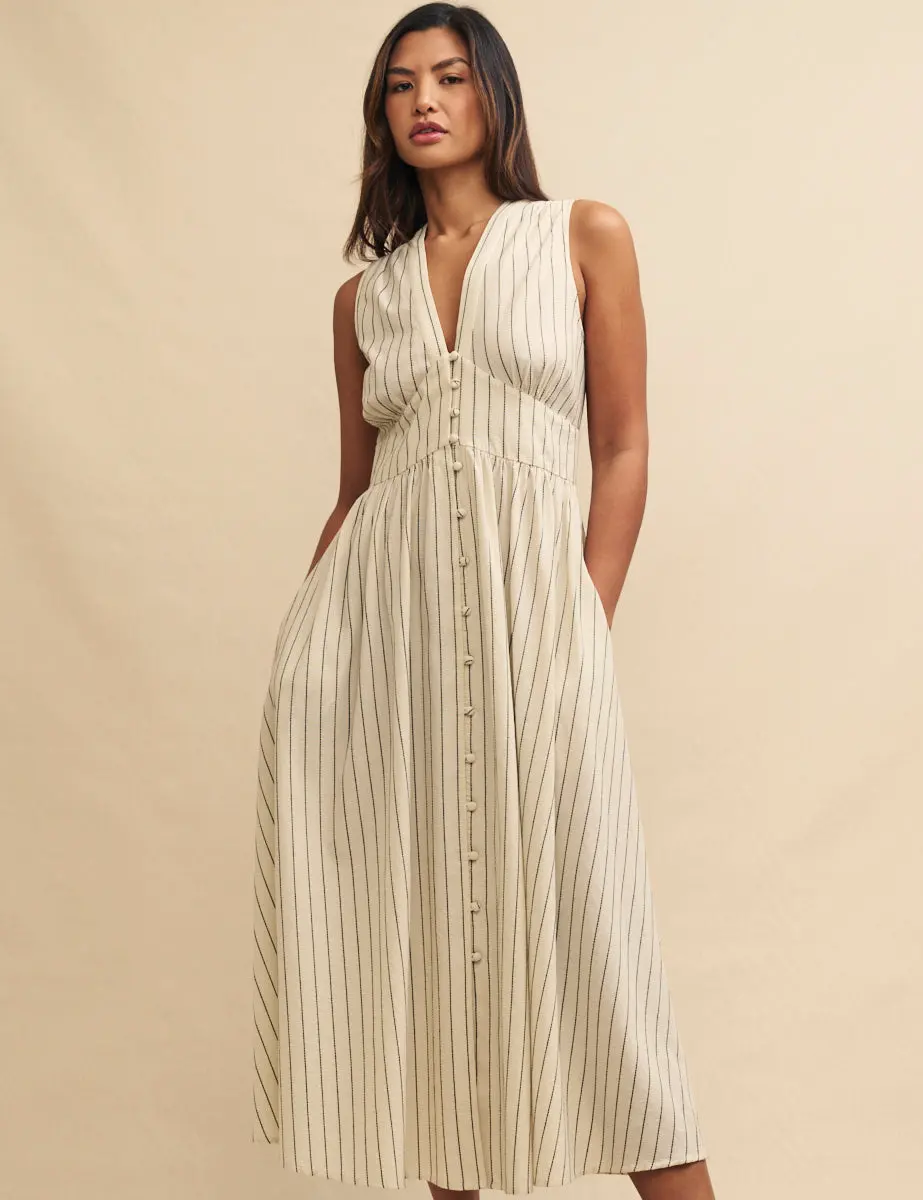 Our sleeveless Starlight is ready for days spent in the sun. Made entirely from organic cotton, this cream pinstripe dress is sure to be a favourite summer after summer. We're obsessed with her soft gathering and pretty line of covered buttons - she's even got pockets. Just add chunky sliders. Low v-neck Covered buttons Pockets Panelled waist designed to flatter A-line skirt that skims the body