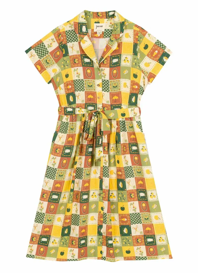 We’re seeing a pattern here. The Carly Dress is crafted from our favourite breezy fabric with LENZING™ ECOVERO™ viscose fibres in an all-over patchwork print with gingham checks and polka dots alongside illustrated cats, flowers, umbrellas, fruits, books, and other cottagecore-inspired motifs. Featuring a retro collar and revere, horn-effect buttons down the front, short sleeves, a matching self-tie waist belt, and pockets at the hip, Carly is the vintage-inspired midi dress that we can’t get enough of.Dellen is 5'8 and is wearing a UK size 16Regular fit - take your usual sizeUK Size 10 dress length: 115cmAll-over illustrated patchwork printMidi-length skirtShort sleevesHorn-effect buttonsTie waistPocketsFor specific measurements of this garment, please see the Size Guide.
