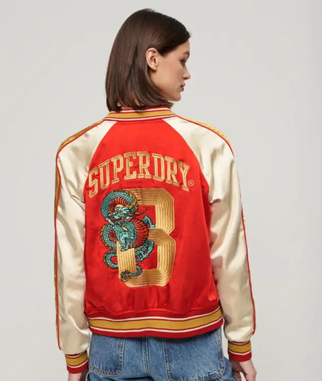 The Suikajan jacket takes an iconic bomber style and elevates it to bring you an inspired piece that seamlessly blends cultures. Our Chinese New Year Suikajan Jacket takes this even further by pairing it with iconic Chinese motifs. A lightweight option for those transitional months, this jacket will help keep the edge off whilst elevating your authentic style. Relaxed fit - the classic Superdry fit. Not too slim, not too loose, just right. Go for your normal size Long raglan sleeves Zip fastening Embroidered 'High Flyers' graphic on the chest Ribbed cuffs and hem Popper fastening pockets Fully lined Embroidered Superdry graphic on the back, with an intertwining dragon Embroidered logo