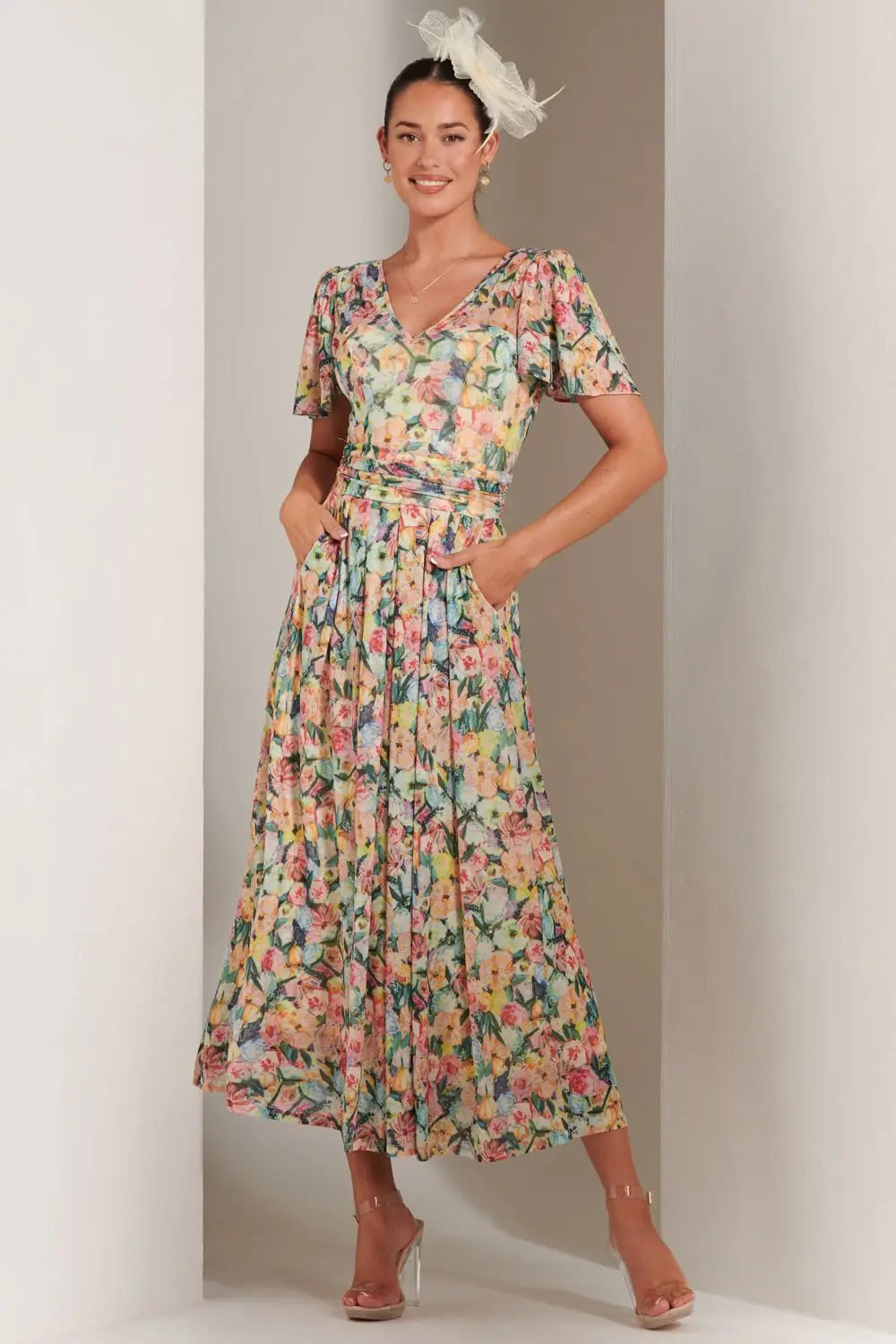 Opt for feminine charm with the Bianca pleated mesh maxi dress from Jolie Moi. Complimented with a captivating floral pattern print, a v-neckline, short angel sleeves and a pleated hemline. Fashioned with an elasticated ruched waistband for a form-fitting silhouette and 2 side pockets.