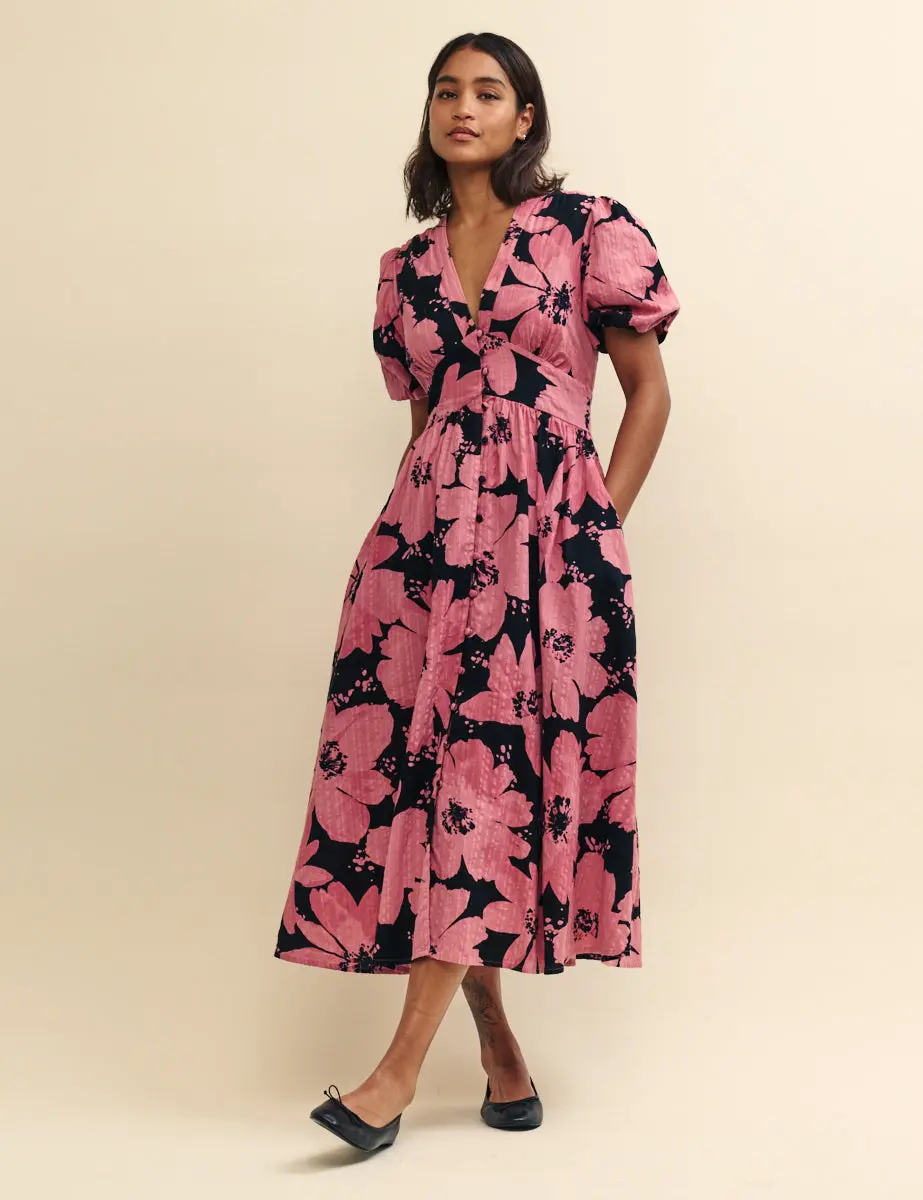 Our iconic style: Starlight. Made entirely from responsible cotton, this pink floral one comes in a light seersucker texture that's perfect for all that incoming sunshine. We're obsessed with her soft gathering, puff sleeves and pretty line of covered buttons - she's even got pockets. Style yours with ballet shoes to complete the look.Low v-neck Short puff sleeves Covered buttons • Pockets Panelled waist designed to flatter A-line skirt that skims the body