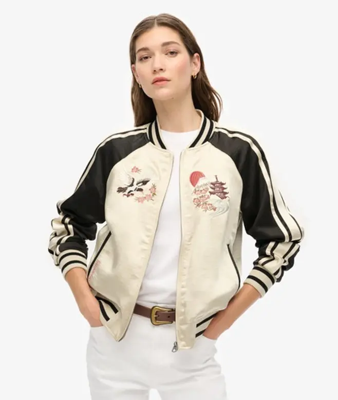 Superdry Women's Colourblock Sukajan Embroidered Bomber Jacket, Cream and Black,
