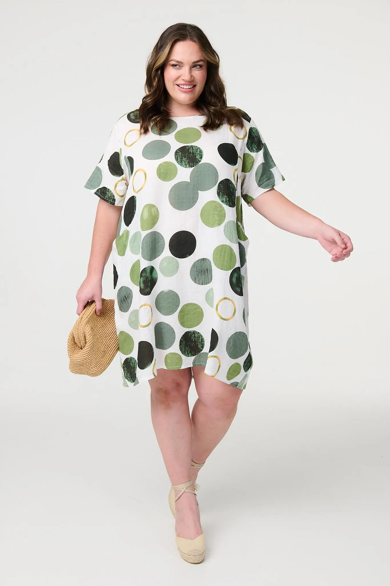 Add a statement polka dot print to your capsule wardrobe with this relaxed fit tunic dress. It has a round neck, short sleeves, pockets and a short length hem. Made from a lightweight and breathable cotton and viscose blend fabric it's the perfect addition to a warm weather wardrobe. Team with fresh trainers or flat sandals for an on-trend casual style. Product Code: D515791