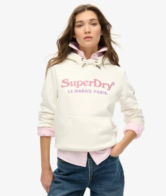 Add a dash of sparkle into your off-duty everyday. The Metallic Venue hoodie will do that for you. With its vintage wash and lighter-weight fabric, this hoodie gives you extra options when it comes to building your outfit. The classic overhead design is rooted in casual and allows you to bring your own personality to your style. Relaxed fit - the classic Superdry fit. Not too slim, not too loose, just right. Go for your normal size Classic overhead design Vintage wash Lined hood with drawcord adjuster Front pouch pocket Ribbed cuffs and hem Unbrushed loopback lining Glitter and rhinestone logo print Branded hardware Sleeve logo patch Soho, London text