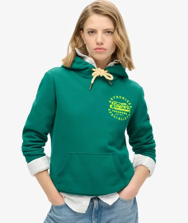 Superdry Women's Neon Embroidered Graphic Hoodie Green / Storm Green -