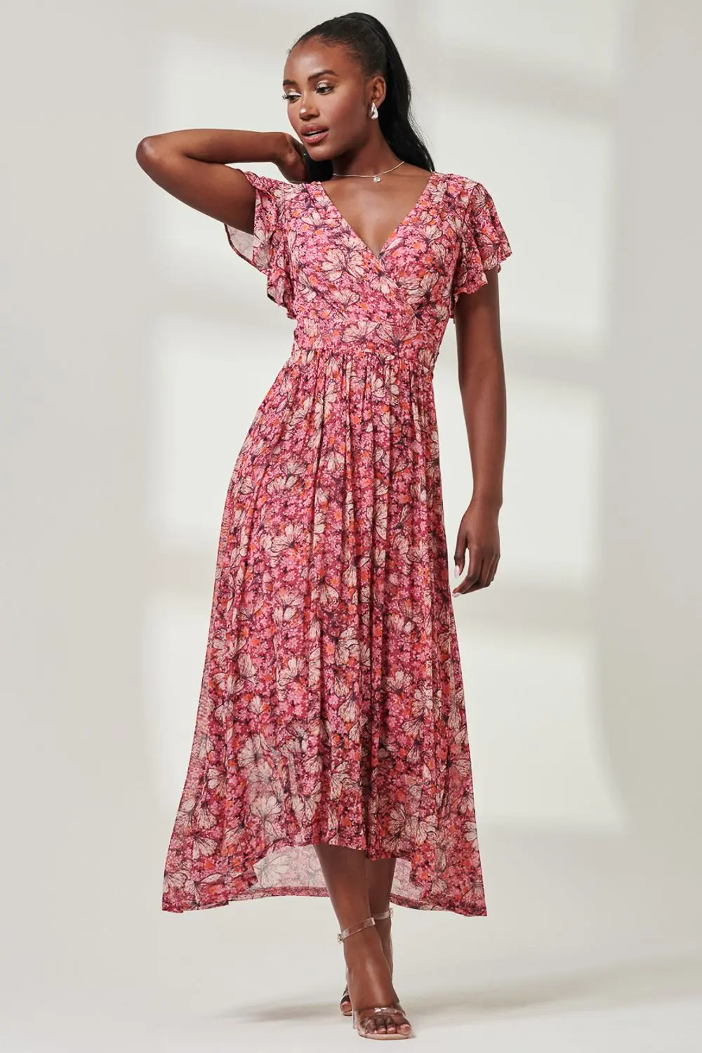 Embrace the allure of timeless elegance in this Wrap Dipped Hem Mesh Dress from Jolie Moi, showcasing a mesmerizing abstract pattern that blooms beauty. Framed by a graceful v-neckline and playful frilly cap sleeves, a self tie waist, with a flowing high-low hem silhouette adding effortless movement. Crafted from the softest knitted mesh fabric and fully lined with two side pockets.