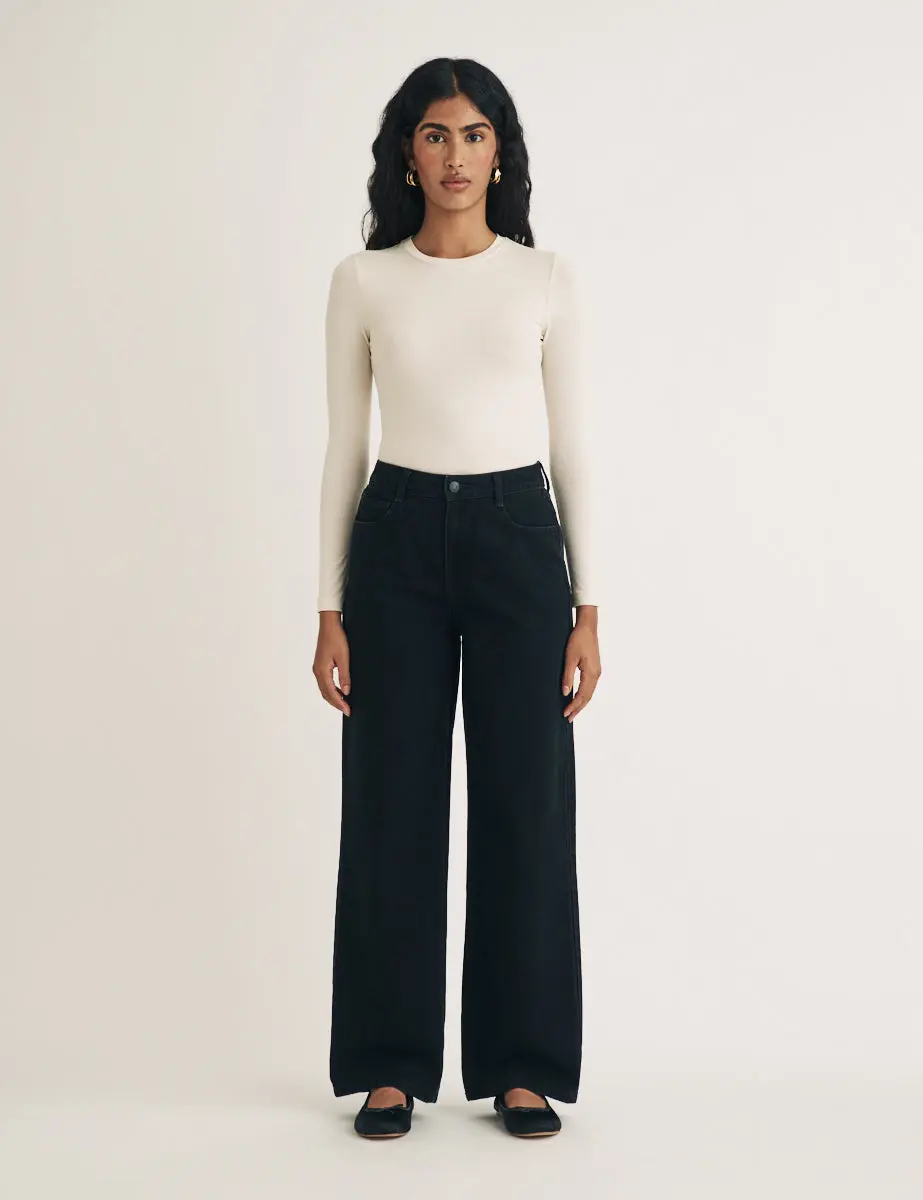 Your new go-to denim. These jeans are a classic high rise and are balanced by a relaxed wide leg. Designed to flatter, this style sits close to the body at the waist and hips. We're obsessed with the classic black. For that stylish look, wear with your favourite white tee.Regular fit Classic five pocket style Black metal NC button Wide leg cut Zip fly Length tip: this style has a regular leg Find your perfect fit using our size guide