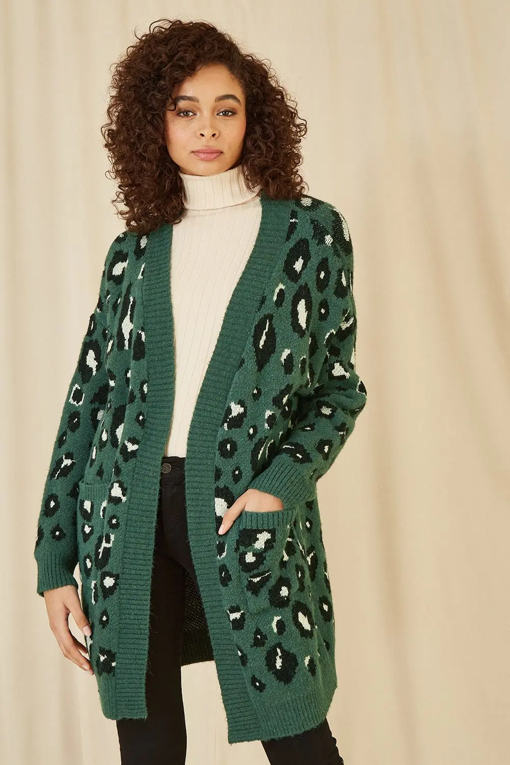 Stay warm in style this season in this bang on trend long green knitted cardigan. Crafted with an intarsia knit in animal print, this cardigan features roomy pockets and ribbed block colour edging.