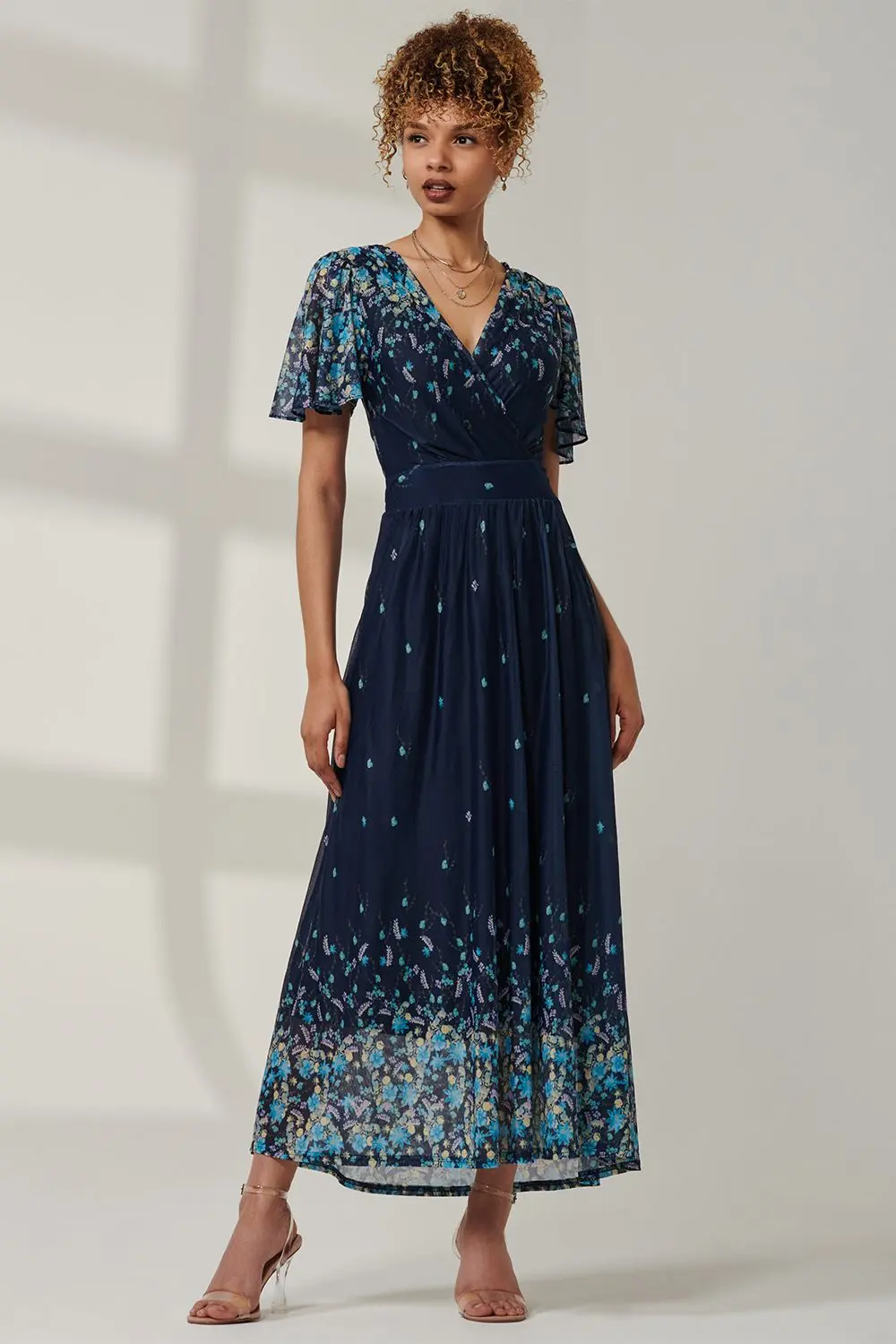 Jolie Moi Women's Mirrored Mesh Angel Sleeve Maxi Dress in Dark Blue