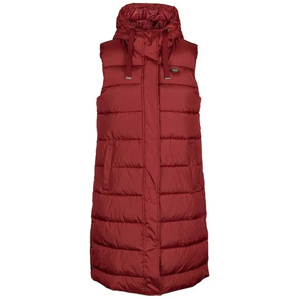 Material: 100% Polyester. Fabric: Pongee. Lining: Taffeta. Design: Logo, Quilted. Fabric Technology: Durable, Insulating. Neckline: Hooded. Sleeve-Type: Sleeveless. Stitched Baffles, Storm Flap. Hood Features: Drawstring, Grown On Hood. Length: Long. Pockets: 2 Side Pockets. Fastening: Concealed, Full Zip, Stud.
