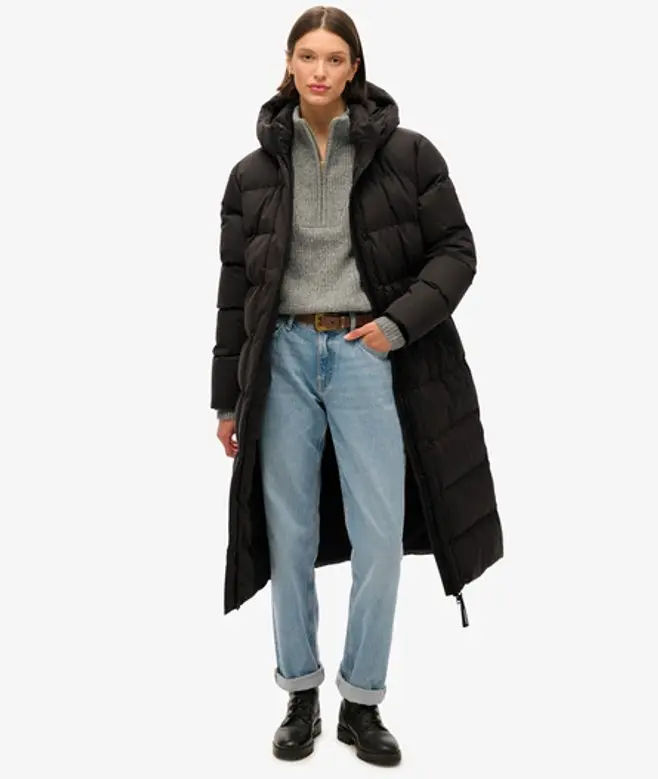 Superdry Women's Classic Microfibre Longline Puffer Coat, Black,
