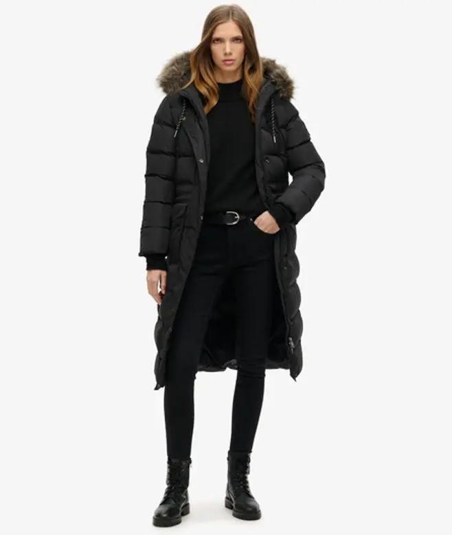 Every good day starts with a reliable jacket. Stay cosy and on-trend all day long with our Everest Faux Fur Longline Jacket, featuring a detachable fur trim and a plethora of handy pockets. Stylishly longline, this flattering style will compliment all of your cold-weather outfits, and will give you an authentic silhouette that is just so easy to rock. Relaxed fit - the classic Superdry fit. Not too slim, not too loose, just right. Go for your normal size Hood with detachable faux fur trim and adjustable drawcords Longline Padded throughout Four external pockets One internal pocket Ribbed cuffs Adjustable waist cord Side seam poppers Signature badge