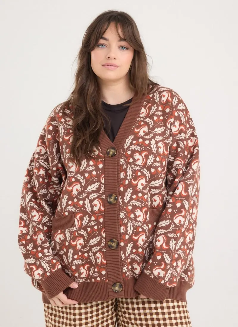 Joanie Clothing Oakley Autumnal Squirrel Print Oversized Cardigan