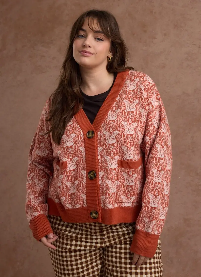 Our favourite cosy cardy is back and better than ever in a new rust-toned fox intarsia design that’s perfect for autumn dressing! Made using a blend of LENZING™ ECOVERO™ branded viscose fibres, recycled polyester fibres, and recycled polyamide fibres, this new blended yarn is a more conscious alternative to our previous knitwear blend. Featuring a boxy, oversized fit with a slightly dropped back hem, retro oversized buttons down the front, and split detailing on the hem, this foxy knit is bound to be your new transitional go-to!Dee is 5’9.5” and is wearing a UK size SSha is 5’9.5” and is wearing a UK size LOversized boxy fit - take your usual sizeNew and improved conscious knitwear blendAll-over rust-toned fox intarsia designSlightly dropped black hemRetro horn-effect buttonsSplit detailing on the hemFor specific measurements of this garment, please see the Size Guide.