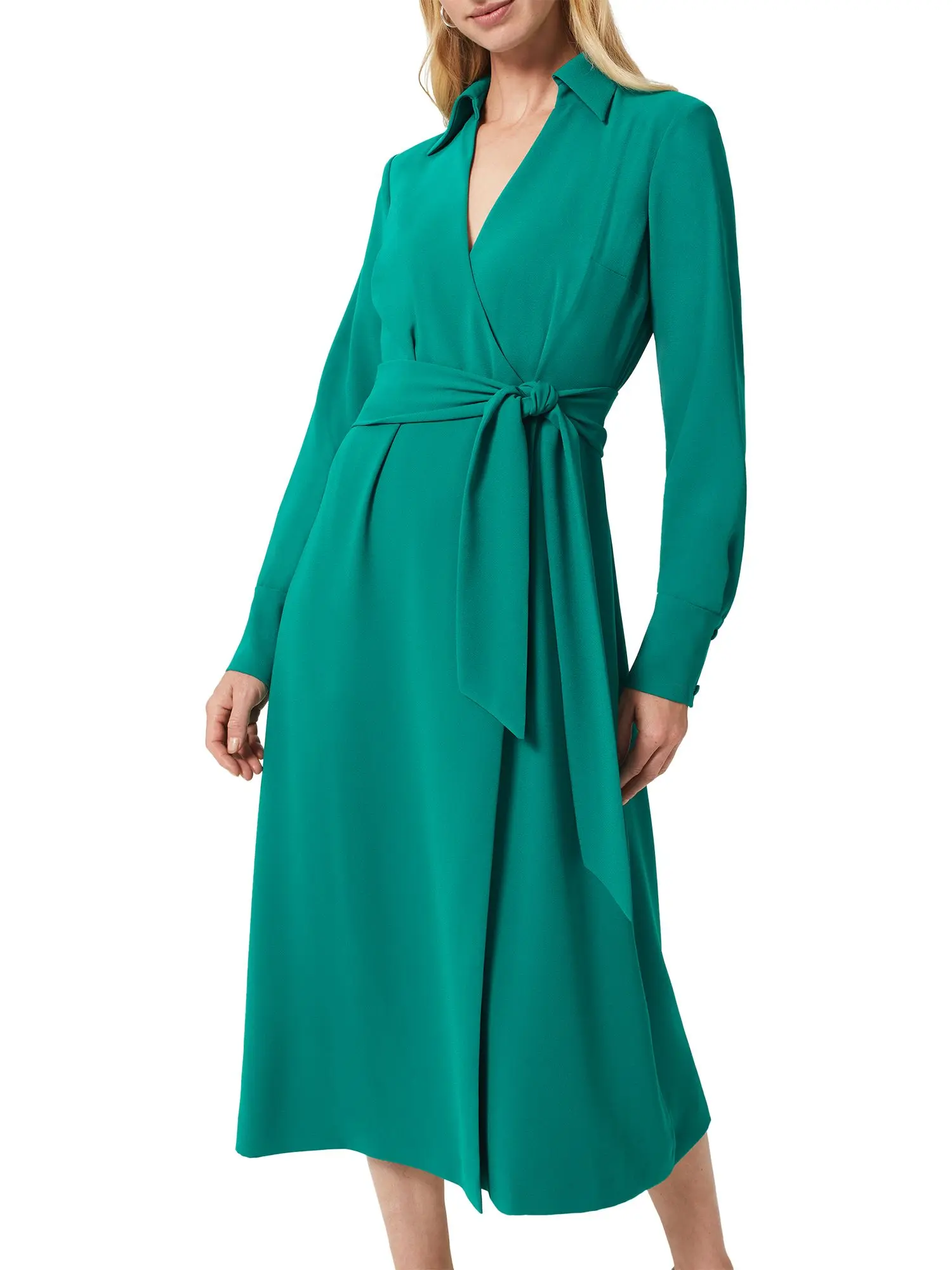 Awash with a beautiful sea green hue, the endlessly flattering Prue midi wrap dress has `ready in one' appeal. Featuring a wrap design, fit and flare shape with self-tie belt and side slip pockets.