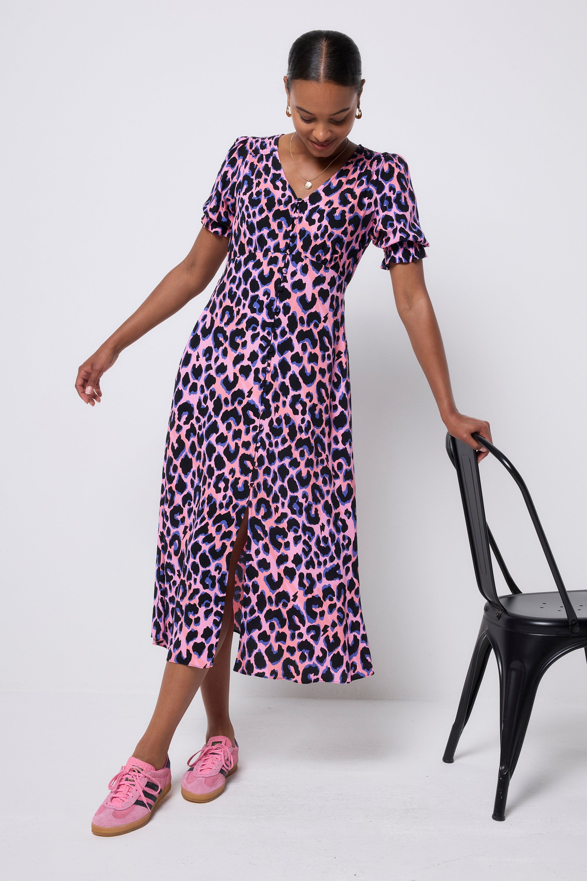 Our bold and brightly coloured pink with blue and black shadow leopard and lightning bolt flute sleeve midi tea dress is a must have this season. Made in a soft viscose crepe fabric, this versatile midi-length dress features a timeless V-neck. Team it with trainers for an easy everyday look and heels for an effortless evening outfit. Made from 100% soft viscose crepe with EcoVero V-neck Short blouson sleeves with frill at cuff Functioning button placket Empire seam Pockets Signature neon pink embroidered lightning bolt on sleeve Model in image 1 is Size 8 Height 5'7 Wearing a size 8 Discover more leopard print midi dresses.